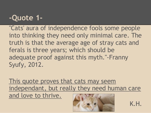 6. 6. -Quote 1-"Cats aura of independence fools some peopleinto thinking they need only minimal care. Thetruth is that the average age of stray cats andferals is three years; which should beadequate proof against this myth."-FrannySyufy, 2012.This quote proves that cats may seemindependant, but really they need human careand love to thrive. K.H.