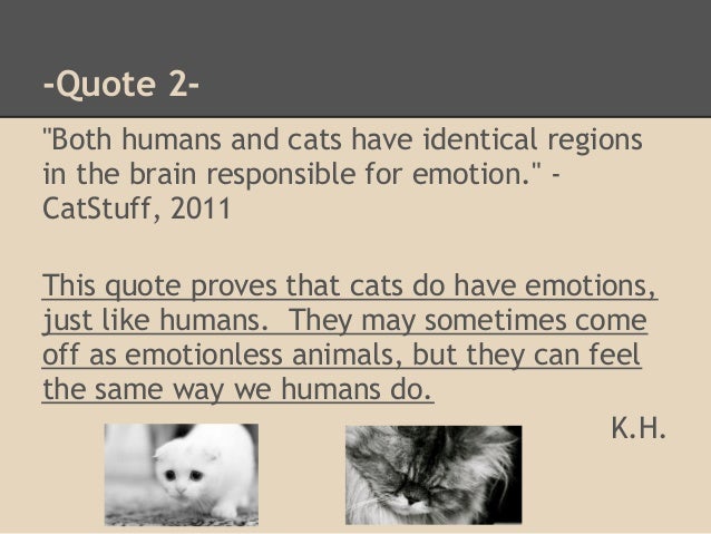 7. 7. -Quote 2-"Both humans and cats have identical regionsin the brain responsible for emotion." -CatStuff, 2011This quote proves that cats do have emotions,just like humans. They may sometimes comeoff as emotionless animals, but they can feelthe same way we humans do. K.H.