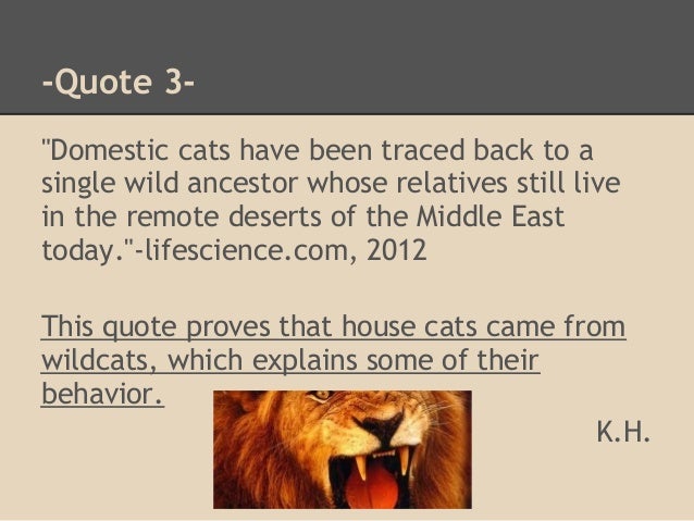 8. 8. -Quote 3-"Domestic cats have been traced back to asingle wild ancestor whose relatives still livein the remote deserts of the Middle Easttoday."-lifescience.com, 2012This quote proves that house cats came fromwildcats, which explains some of theirbehavior. K.H.