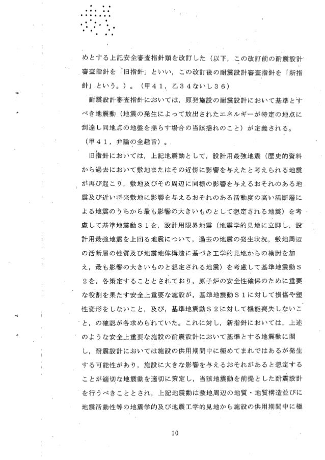 10. 10. 吋 ‘6 .• •...• •• • • • • e e . ....... •.. ..• • めとする上記安全審査指針類を改訂した(以下,この改訂前の耐震設計 審査指針を「旧指針」といい,この改訂後の耐震設計審査指針を「新指 針」という。) 0 (甲 41,乙 34ないし 36) 耐震設計審査指針においては,原発施設の耐震設計において基準とす べき地震動(地震の発生によって放出されたエネルギーが特定の地点に 到達し同地点の地盤を揺らす場合の当該揺れのこと)が定義される。 (甲 41,弁論の全趣旨)。 旧指針においては,上記地震動として,設計用最強地震(歴史的資料 から過去において敷地またはその近傍に影響を与えたと考えられる地震 が再び起こり,敷地及びその周辺に同様の影響を与えるおそれのある地 震及び近い将来敷地に影響を与えるおそれのある活動度の高い活断層に よる地震のうちから最も影響の大きいものとして想定される地震)を考 慮して基準地震動 S 1を,設計用限界地震(地震学的見地に立脚し,設ー 計用最強地震を上回る地震について,過去の地震の発生状況,敷地周辺 の活断層の性質及び地震地体構造に基づき工学的見地からの検討を加 え,最も影響の大きいものと想定される地震)を考慮して基準地震動 S 2を,各策定することとされており,原子炉の安全性確保のために重要 な役割を果たす安全上重要な施設が,基準地震動 S 1に対して損傷や塑 性変形をしないこと,及び,基準地震動 S2に対して機能喪失しないこ と,の確認が各求められていた。これに対し,新指針においては,上述 のような安全上重要な施設の耐震設計において基準とする地震動に関 し,耐震設計においては施設の供周期間中に極めてまれではあるが発生 する可能性があり,施設に大きな影響を与えるおそれがあると想定する ことが適切な地震動を適切に策定し,当該地震動を前提とした耐震設計 を行うべきこととされ,上記地震動は敷地周辺の地質・地質構造並びに 地震活動性等の地震学的及び地震工学的見地から施設の供周期間中に極 10