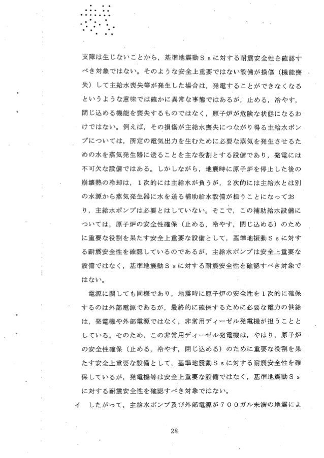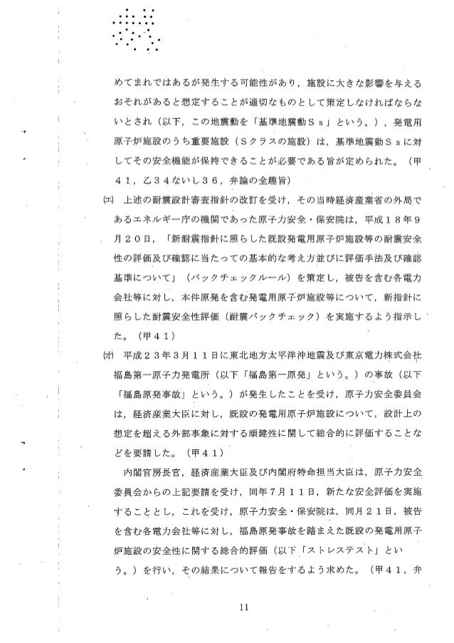 11. 11. -・.....-・・・__e _ • •・.・ ..・. .・.・・.. めてまれではあるが発生する可能性があり,施設に大きな影響を与える おそれがあると想定することが適切なものとして策定しなければならな 発電用という。) ,この地震動を「基準地震動 S sJいとされ(以下, -. 基準地震動 Ssに対は,原子炉施設のうち重要施設 (Sクラスの施設) 国ー その当時経済産業省の外局で してその安全機能が保持できることが必要である旨が定められた。 乙 34ないし 36,弁論の全趣旨) 上述の耐震設計審査指針の改訂を受け, あるエネルギー庁の機関であった原子力安全・保安院は, 41, 件) 平成 18年 9 「新耐震指針に照らした既設発電用原子炉施設等の耐震安全 性の評価及び確認に当たっての基本的な考え方並びに評価手法及び確認、 月 20日, を策定し,被告を含む各電力(パックチェックルール)基準について」 本件原発を含む発電用原子炉施設等について,新指針に会社等に対し, を実施するよう指示し、照らした耐震安全性評価(耐震パックチェック) (甲 4 1)た。 平成 23年 3月 11日に東北地方太平洋沖地震及び東京電力株式会社附 の事故(以下とし、う。)福島第一原子力発電所(以下「福島第一原発」 原子力安全委員会が発生したことを受け,という。)「福島原発事故J 設計上のは,経済産業大臣に対し,既設の発電用原子炉施設について, 想定を超える外部事、象に対する頑健性に関して総合的に評価することな 司 a (甲 41)どを要請した。 原子力安全内閣官房長官,経済産業大臣及び内閣府特命担当大臣は, 同年 7月 11日,新たな安全評価を実施 同月 21日,被告原子力安全・保安院は, を含む各電力会社等に対し,福島原発事故を踏まえた既設の発電用原子 委員会からの上記要請を受け, これを受け,することとし, 弁 とい (甲 41, 炉施設の安全性に関する総合的評価(以下「ストレステスト」 その結果について報告をするよう求めた。 11 を行い,う。)