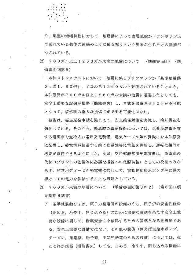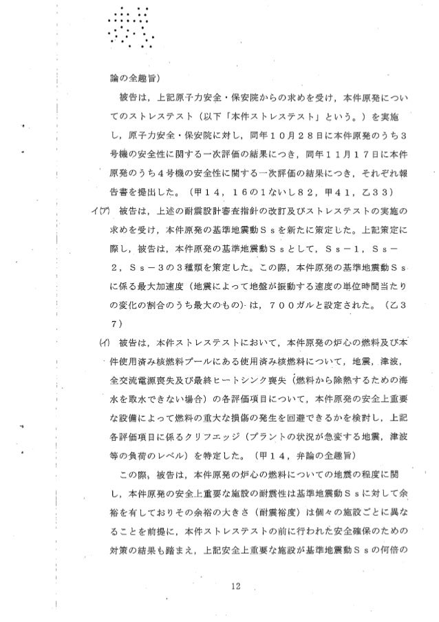 12. 12. 4陶 一-, • •• ・・・ .. • • • • • e e • •..・ ・ .・・ .・ . ・ • •• 論の全趣旨) 被告は,上記原子力安全・保安院からの求めを受け,本件原発につい てのストレステスト(以下「本件ストレステスト」という。)を実施 し,原子力安全・保安院に対し,同年 10月 28日に本件原発のうち 3 号機の安全性に関する一次評価の結果につき,同年 11月 17日に木件 原発のうち 4号機の安全性に関する一次評価の結果につき,それぞれ報 告書を提出した。(甲 14, 16の 1ないし 82,甲 4 1,乙 33) イケ) 被告は,上述の耐震設計審査指針の改訂及びストレステストの実施の 求めを受け,本件原発の基準地震動 Ssを新たに策定じた。上記策定に 際し,被告は,本件原発の基準地震動 S sとして, Ss-l, Ss 2, S s- 3の 3種類を策定した。この際,本件原発の基準地震動 S s に係る最大加速度(地震によって地盤が振動する速度の単位時間当たり の変化の割合のうち最大のもの)は, 700ガルと設定された。(乙 3 7) 川 被告は,本件ストレステストにおいて,本件原発の炉心の燃料及び本 !件使用済み核燃料プールにある使用済み核燃料について,地震,津波, 全交流電源喪失及び最終ヒートシンク喪失(燃料から除熱するための海 水を取水できない場合)の各評価項目について,本件原発の安全上重要 な設備によって燃料の重大な損傷の発生を回避できるかを検討し,上記 各評価項目に係るクリフエッジ(プラントの状況が急変する地震,津波 等の負荷のレベル)を特定した。(甲 14,弁論の全趣旨) この際3 被告は,本件原発の炉心の燃料についての地震の程度に関 し,本件原発の安全上重要な施設の耐震性は基準地震動 Ssに対して余 裕を有しておりその余裕の大きさ(耐震裕度)は個々の施設ごとに異な ることを前提に,本件ストレステストの前に行われた安全確保のための 対策の結果も踏まえ,上記安全上重要な施設が基準地震動 S sの何倍の 12