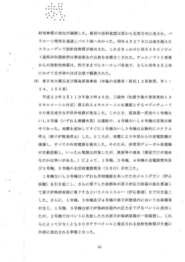 16. 16. -・.-・・ ..-・・・... ••••••••• • • • • •• 射性物質の放出が継続した。最初の放射能雲は西から北西方向に流され,ベ ラルーシ南部を通過しバルト海へ向かった。同年 4月 27日には海を越えた スウェーデンで放射性物質が検出され,これをきっかけに同月 28日ソビエ ト連邦共和国政府は事故発生の公表を余儀なくされた。チェルノブイリ原発 からの放射性物質は,同月末までにヨーロッパ各地で,さらに同年 5月上旬 にかけて北半球のほぼ全域で観測された。 (9) 東日本大震災及び福島原発事故(弁論の全趣旨・訴状 12頁参照,甲 1 ・ 24, 150頁) 平成 23年 3月 11日午後 2時 46分,三陸沖(牡鹿半島の東南東約 13 0キロメートル付近)深さ約 24キロメートルを震源とするマグ、ニチュード 9の東北地方太平洋沖地震が発生した。このとき,福島第一原発の 1号機な いし 3号機(いずれも沸騰水型)は運転中, 4号機ないし 6号機は定期点検 中であった。地震を感知してすぐに 1号機ないし 3号機は自動的にスクラム 停止(原子炉緊急停止)した。ところが,地震により外部からの送電設備が 損傷し,すべての外部電源を喪失した。そのため,非常用ディーゼノレ発電機 が自動起動し,いったん電源は回復したが,津波等の理由(津波だけが理由 なのかは争いがある。)によって, 1号機, 2号機, 4号機の全電源喪失及 び 3号機, 5号機の全交流電源喪失 (SB0) が生じた。 1号機ないし 3号機はいずれも冷却機能を失つだためメルトダウン(炉心 溶融)を引き起こし,さらに落下した核燃料が原子炉圧力容器の底を貫通し て原子炉格納容器に落下するというメルトスルー(炉心貫通)まで引き起こ した。さらに, 1号機, 3号機及び 4号機の原子炉建屋内において水素爆発 が生じ, 1号機, 3号機は原子炉格納容器内の圧力を下げるべントに成功し たが, 2号機ではべントに失敗したため原子炉格納容器が一部破損し,これ らによって少なくとも 90万テラベクレルと推定される放射性物質が大量に 外部に放出される事態となった。 16