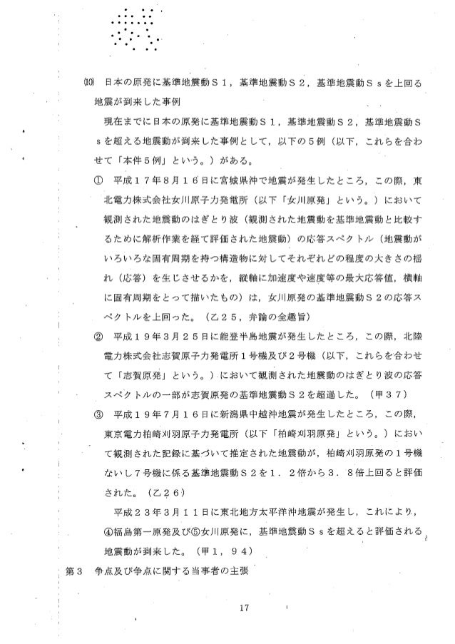 17. 17. l 第 3 (10) - ・・.・・・ ・.・・..... ・ .• •・ ..・. .・.・... 日本の原発に基準地震動 S1,基準地震動 S2,基準地震動 ssを上回る 地震が到来した事例 現在までに日本の原発に基準地震動 S1,基準地震動 S2,基準地震動 S sを超える地震動が到来した事例として, 以下の 5例(以下, これらを合わ せて「本件 5例」 という。) がある。 ① 平 成 17年 8月 16日に宮城県沖で地震が発生したところ, この際,東 北電力株式会社女川原子力発電所(以下「女川原発J という。)において 観測された地震動のはぎとり波(観測された地震動を基準地震動と比較す るために解析作業を経て評価された地震動)の応答スペクトノレ (地震動が いろいろな固有周期を持つ構造物に対してそれぞれどの程度の大きさの揺 れ(応答) を生じさせるかを, 縦軸に加速度や速度等の最大応答値,横軸 に固有周期をとって描いたもの) は,女川原発の基準地震動 S2の応答ス ベクトルを上回った。 (乙 25,弁論の全趣旨) ② 平 成 19年 3月 25日に能登半島地震が発生したところ, この際,北陸 電力株式会社志賀原子力発電所 1号機及び 2号機(以下, これらを合わせ て 「志賀原発」 という。)において観測された地震動のはぎとり波の応答 スペクトルの一部が志賀原発の基準地震動 S2を超過した。 (甲 3 7) ③ 平 成 19年 7月 16日に新潟県中越沖地震が発生したところ, この際, 東京電力柏崎刈羽原子力発電所(以下「柏崎刈羽原発」 という。)におい て観測された記録に基づいて推定された地震動が, 柏崎刈羽原発の 1号 機 ないし 7号機に係る基準地震動 S2を 1. 2f:苦から 3. 8倍上回ると評価 された。 (乙 26) 平 成 23年 3月 11日に東北地方太平洋沖地震が発生し, これにより, ④福島第一原発及び⑤女川原発に, 基準地震動 Ssを超えると評価される f 地震動が到来した。 (甲 1, 94) 争点及び争点に関する当事者の主張 17