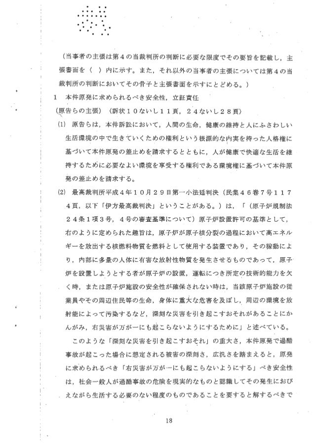 18. 18. 心 .・. ・・ .••••••••• • •• •. ..-・.• .・... (当事者の主張は第 4の当裁判所の判断に必要な限度でその要旨を記載し,主 張 書 面 を ( )内に示す。また,それ以外の当事者の主張については第 4の当 裁判所の判断においてその骨子と主張書面を示すにとどめる。) 1 本件原発に求められるべき安全性,立証責任 (原告らの主張) (訴状 10ないし 11頁, 24ないし 28頁〉 (1) 原告らは,本件訴訟において,人間の生命,健康の維持と人にふさわしい 生活環境の中で生きていくための権利という根源的な内実を持った人格権に 基づいて本件原発の差止めを請求するとともに,人が健康で快適な生活を維 持するために必要なよい環境を享受する権利である環境権に基づいて本件原 発の差止めを請求する。 (2) 最高裁判所平成 4年 10月 2.9日第一小法廷判決(民集 46巻 7号 117 4頁,以下「伊方最高裁判決」ということがある。)は, I(原子炉規制法 24条 1項 3号, 4号の審査基準について)原子炉設置許可の基準として, 右のように定められた趣旨は,原子炉が原子核分裂の過程において高エネル ギーを放出する核燃料物質を燃料として使用する装置であり,その稼動によ り,内部に多量の人体に有害な放射性物質を発生させるものであって,原子 炉を設置しようとする者が原子炉の設置,運転につき所定の技術的能力を欠 く時,または原子炉施設の安全性が確保されない時は,当該原子炉施設の従 業員やその周辺住民等の生命,身体に重大な危害を及ぼし,周辺の環境を放 射能によって汚染するなど,深刻な災害を引き起こすおそれがあることにか んがみ,右災害が万が一にも起こらないようにするために」と述べている。 このような「深刻な災害を引き起こすおそれ」の重大さ,本件原発で過酷 事故が起こった場合に想定される被害の深刻さ,広汎さを踏まえると,原発 に求められるべき「右災害が万が一にも起こらないようにする」べき安全性 は,社会一般人が過酷事故の危険を現実的なものと認識してその発生におび えながら生活する必要のない程度のものであることを要すると解するべきで 18