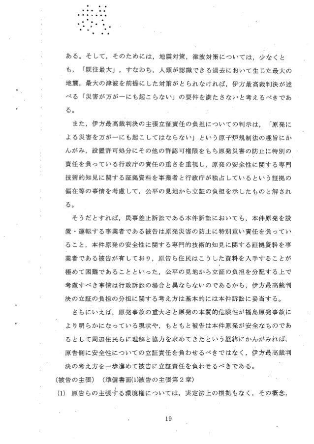 19. 19. .・. ・・ .•••--e ••• -• • ・, • • .• • • • •• ある。そして,そのためには,地震対策,津波対策については,少なくと も, I既往最大J,すなわち,人類が認識できる過去において生じた最大の 地震,最大の津波を前提にした対策がとられなければ,伊方最高裁判決が述 べる「災害が万が一にも起ニらない」の要件を満たさないと考えるべきであ る。 また,伊方最高裁判決の主張立証責任の負担についての判示は, I原発に よる災害を万が一にも起こしてはならなしリという原子'炉規制法の趣旨にか んがみ,設置許可処分にその他の許認可権限をもち原発災害の防止に特別の 責任を負っている行政庁の責任の重さを重視し,原発の安全性に関する専門 技術的知見に関する証拠資料を事業者と行政庁が独占しているという証拠の 偏在等の事情を考慮、して,公平の見地から立証の負担を示したものと解され る。 ー そうだとすれば,民事差止訴訟である本件訴訟においても,本件原発を設 置・運転する事業者である被告は原発災害の防止に特別重い責任を負ってい ること,本件原発の安全性に関する専門的技術的知見に関する証拠資料を事 業者である被告が有しており,原告ら住民はこうした資料を入手することが 極めて困難であることといった,公平の見地から立証の負担を分配する上で 考慮すべき事情は行政訴訟の場合と異ならないのであるから,伊方最高裁判 決の立証の負担の分担に関する考え方は基本的には本件訴訟に妥当する。 さらにいえば,原発事故の重大ーさと原発の本質的危険性が福島原発事故に より明らかになっている現状や,もともと被告は本件原発が安全なものであ るとして周辺住民らに理解と協力を求めてきたという経緯にかんがみれば, 原告側に安全性についての立証責任を負わせるべきではなく,伊方最高裁判 決の考え方を一歩進めて被告に立証責任を負わせるべきである。 (被告の主張) (準備書面(1)被告の主張第 2章〉 (1) 原告らの主張十る環境権については,実定法上の根拠もなく,その概念, 19