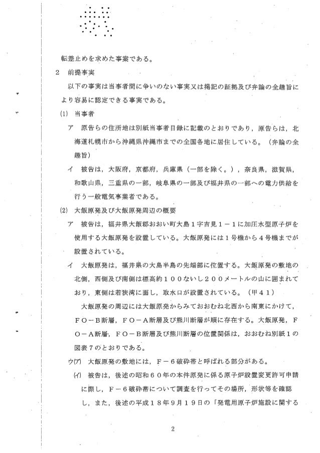 2. 2. .・ • ••• ••••••••• • •• •. .... ... ・... ,. 転差止めを求めた事案である。 2 前提事実 以下の事実は当事者聞に争いのない事実又は掲記の証拠及び弁論の全趣旨に より容易に認定できる事実である。 (1) 当事者 ア 原告らの住所地は別紙当事者目録に記載のとおりであり,原告らは,北 海道札幌市から沖縄県沖縄市までの全国各地に居住している。(弁論の全 v 趣旨) イ 被告は,大阪府,京都府,兵庫県(一部を除く。) ,奈良県,滋賀県, 和歌山県,三重県の一部,岐阜県の一部及び福井県の一部への電力供給を 行う一般電気事業者である。 (2) 大飯原発及び大飯原発周辺の概要 ア 被告は,福井県大飯郡おおい町大島 1字書見 1- 1に加圧水型原子炉を 使用する大飯原発を設置している。大飯原発には 1号機から 4号機までが 設置されている。 イ 大飯原発は,福井県の大島半島の先端部に位置する。大飯原発の敷地の 北側,西側及び南側lは標高約 100ないし 200メートルの山に固まれて おり,東側は若狭湾に面し,取水口が設置されている。(甲 41) 伊 大飯原発の周辺には大飯原発からみておおむね北西から南東にかけて, FO-B断層, FO-A断層及び熊川断層が順に存在する。大飯原発, F O-A断層, FO-B断層及び熊川断層の位置関係、は,おおむね別紙 1の 図表 7のとおりである。 ウfア1大飯原発の敷地には, F -6破砕帯と呼ばれる部分がある。 川 被告は,後述の昭和 60年の本件原発に係る原子炉設置変更許可申請 に際し, F -6破砕帯について調査を行ってその場所,形状等を確認 し,また,後述の平成 18年 9月 19日の「発電用原子炉施設に関する 2