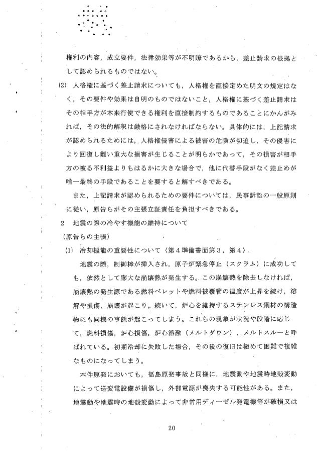 20. 20. .'.. . . .. l' ・g ・'"..e • ••••-t ・• • • • • “ ・ 権利の内容,成立要件,法律効果等が不明瞭であるから,差止誇求の根拠と して認められるものではない。 (2) 人格権に基づく差止請求についても,人格権を直接定めた明文の規定はな く,その要件や効果は自明のものではないこと,人格権に基づく差止請求は その相手方が本来行使できる権利を直接制約するものであることにかんがみ れば,その法的解釈は厳格にされなければならない。具体的には,上記請求 が認められるためには,人格権侵害による被害の危険が切迫し,その侵害に より回復し難い重大な損害が生じることが明らかであって,その損害が相手 方の被る不利益よりもはるかに大きな場合で,他に代替手段がなく差止めが 唯一最終の手段であることを要すると解すべきである。 また,上記請求が認められるための要件については,民事訴訟の一般原則 に従い,原告らがその主張立証責任を負担すべきである。 2 地震の際の冷やす機能の維持について (原告らの主張) (1) 冷却機能の重要性について〈第 4準備書面第 3,第 4) 地震の際,制御棒が挿入され,原子炉緊急停止(スクラム)に成功して も,依然として膨大な崩壊熱が発生する。この崩壊熱を除去しなければ, 崩壊熱の発生源である燃料ペレットや燃料被覆管の温度が上昇を続け,溶 解や損傷,崩壊が起こり,〆続いて,炉心を維持するステンレス鋼材の構造 物 lこも同様の事態が起こってしまう。これらの現象が状況や段階に応じ て,燃料損傷,炉心損傷,炉心溶融(メルトダワン) ,メルトスルーと呼 ばれている。初期冷却に失敗した場合,その後の復旧は極めて困難で複雑 なものになってしまう。 本件原発においても,福島原発事故と同様に,地震動や地震時地殻変動 によって送変電設備が損傷し,外部電源が喪失する可能性がある。また, 地震動や地震時の地殻変動によって非常用ディーゼル発電機等が破損又は 20