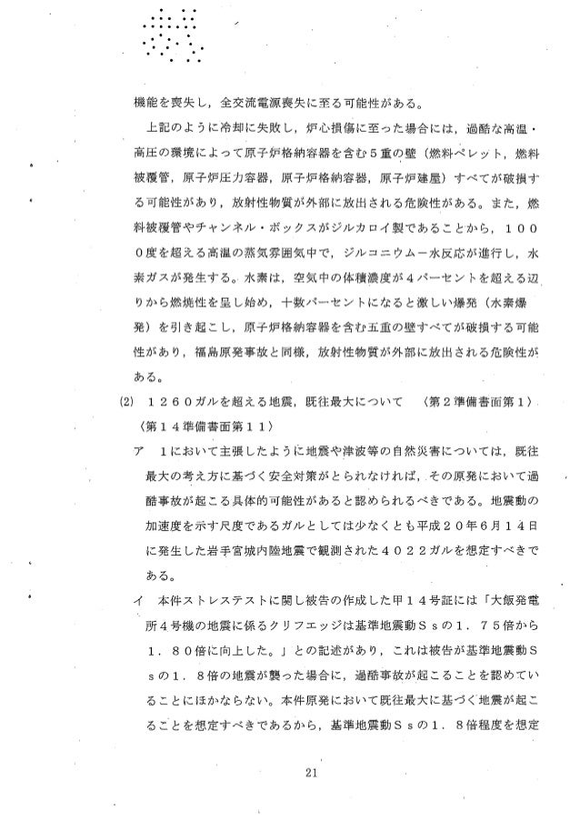 1. 1. 司手 .. " 、“ ...............• • . .." ...・... 平成 26年 5月 21日判決言渡 同日原本領収 裁判所書記官 平成 24年(ワ)第 394号(以下「第 1事件」という。) ,平成 25年(ワ)第 63号(以下「第 2事件」という。) 大飯原発 3, 4号機運転差止請求事件 口頭弁論終結日 平成 26年 3月 27日 判 決 当事者等の表示 別紙当事者目録記載のとおり 主 文 第 1 請求 1 被告は, 51IJ紙原告目録 1記載の各原告に対する関係 で,福井県大飯郡おおい町大島 1字吉見 1- 1におい て,大飯発電所 3号機及び 4号機の原子炉を運転しでは ならない。 2 別紙原告目録 2記載の各原告の請求をいずれも棄却す る。 3 訴訟費用は,第 2項の各原告について生じたものを岡 原告らの負担とし,その余を被告の負担とする。 事 実 及 び 理 由 被告は,福井県大飯郡おおい町大島 1字吉見 1- 1において,大飯発電所 3号 機及び 4号機の原子炉を運転しではならない。 第 2 事案の概要等 1 事案の概要 本件は,第 1事件原告ら及び第 2事件原告ら(以下,両者を合わせて「原告 ら」という。)が,第 1事件及び第 2事件被告(以下単に「被告J という)に 対し,人格権ないし環境権に基づいて選択的に,被告が福井県大飯郡おおい町 大島 1字吉見 1- 1に設置した原子力発電所である大飯発電所(以下「大飯原 発」という。)の 3号機及び 4号機(以下併せて「本件原発」という。)の運 1