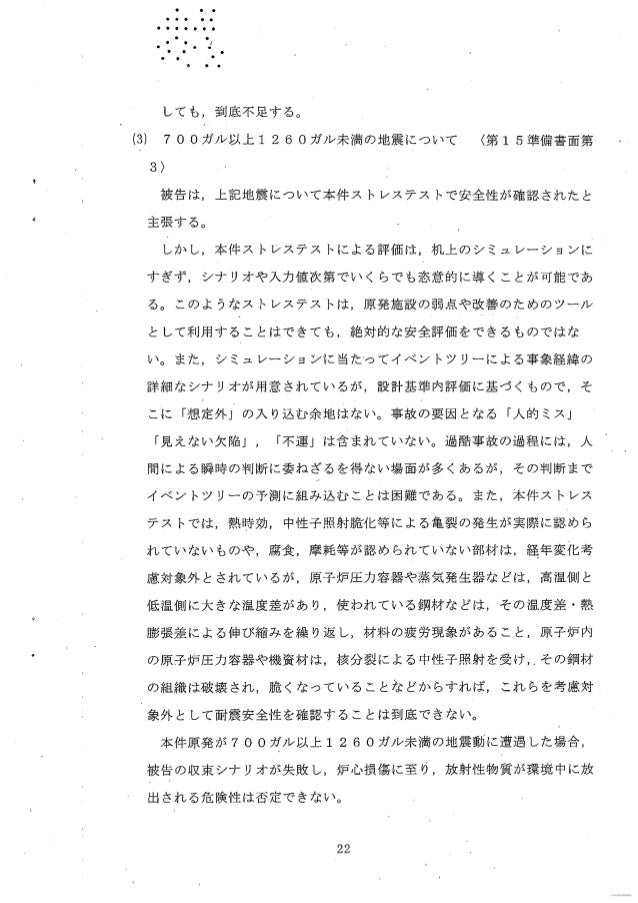21. 21. .-・・ .. ・・・・・.. ノ •••••••• •.-・. 機能を喪失し,全交流電源喪失に至る可能性がある。 上記のように冷却に失敗し,炉心損傷に至った場合には,過酷な高温・ 高圧の環境によって原子炉格納容器を含む 5重の壁(燃料ペレット,燃料 被覆管,原子炉圧力容器,原子炉格納容器,原子炉建屋)すべてが破損す る可能性があり,放射性物質が外部に放出される危険性がある。また,燃 料被覆管やチャンネノレ・ボックスがジルカロイ製であることから, 10 0 0度を超える高温の蒸気雰囲気中で,ジルコニウムー水反応が進行し,水 素ガスが発生する。水素は,空気中の体積濃度が 4パーセントを超える辺 りから燃焼性を呈し始め,十数パーセントになると激しい爆発(水素爆 発)を引き起こし,原子炉格納容器を含む五重の壁すべてが破損する可能 性があり,福島原発事故と同様,放射性物質が外部に放出される危険性が ある。 (2) 1260ガルを超える地震,既往最大について (第 2準備書面第 1) 〈第 14準備書面第 11) ア 1において主張したように地震や津波等の自然災害については,既往 最大の考え方に基づく安全対策がとられなければ,その原発において過 酷事故が起こる具体的可能性があると認められるべきである。地震動の 加速度を示す尺度であるガルとしては少なくとも平成 20年 6月 14日 に発生した岩手宮城内陸地震で観測された 4022ガルを想定すべきで ある。 イ 本件ストレステストに関し被告の作成した甲 14号証には「大飯発電 所 4号機の地震に係るクリフエッジは基準地震動 ssの 1.75倍から 1.80倍に向上した。 Jとの記述があり,これは被告が基準地震動 S sの 1. 8倍の地震が襲った場合に,過酷事故が起こることを認めてい ることにほかならない。本件原発において既往最大に基づく地震が起こ ることを想定すべきであるから,基準地震動 S sの 1. 8倍程度を想定 21