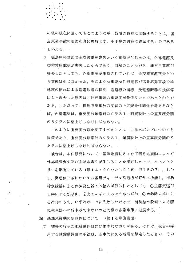 24. 24. ..-・・ .. -・・・... ....• • • • ..... • •• の後の現在に至ってもこのような単→故障の仮定に固執することは,福 島原発事故の要因を真に理解せず,小手先の対策に終始するものである といえる。 ウ 福島原発事故で全交流電源、喪失という事態が生じたのは,外部電源及 び非常用電源が喪失したからであり,当然のことながら,非常用電源が 喪失したとしても,外部電源が維持されていれば,全交流電源喪失とい う事態は生じなかった。そのような重要な外部電源が福島原発事故では 地震の揺れによる送電鉄塔の転倒,送電線の断線,受電遮断器の損傷等 により喪失した原因は,外部電源、の重要度が最低ランクであったからで ある。したがって,福島原発事故の反省の上に安全性確保を考えるなら ば,外部電源、は,重要度分類指針のクラス 1,耐震設計上の重要度分類 の Sクラスに格上げしなければならない。 このように重要度分類を見直すべきことは,主給水ポンプについても 同様であり,重要度分類指針のクラス 1,耐震設計上の重要度分類の S クラスに格上げしなければならない。 被告は,本件原発について,基準地震動 Ssを下回る地震動によって 外部電源喪失及び主給水喪・失が生じることを想定した上で,イベントツ リーを策定している(甲 14 ・20ないし 22頁,甲 16の7)。しか し,緊急停止後において非常用ディーゼ、ル発電機が正常に機能し,補助 給水設備による蒸気発生器への給水が行われたとしでも,①主蒸気逃が し弁による熱放出,②充てん系によるほう酸の添加,③余熱除去系によ る冷却のうち,いずれか一つに失敗しただけで,補助給水設備による蒸 気発生器への給水ができないのと同様の非常事態に進展する。 (5) 基準地震動の信頼性について (第 14準備書面〉 ア 被告の行った地震動評価には根本的な誤りがある。それは,被告の採 用する地震動評価の手法は,基本的にある断層を想定したときの,その 24