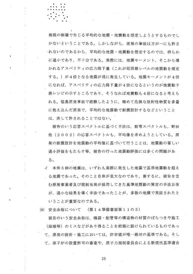 25. 25. .・ •• ••• •••••••••• ..• • • ....... 規模の断層で生じる平均的な地震・地震動を想定しようとするものでし かないということである。しかしながら,原発の事故は万が一にも許さ ・れないのであるから,平均的な地震・地震動を想定するのでは,明らか に過小であり,不十分である。実際には,地震モーメント,そこから導 かれるアスベリティの応力降下量(これが短周期レベルの地震動を規定 する。)が 4倍となる地震が現に発生している。地震モーメントが 4倍 になれば,アスペリティの応力降下量が 4倍になるというのが強震動予 測レシピの示すところであり,そうなれば地震動も 4倍になると考えら れる。福島原発事故で経験したように,極めて危険な放射性物質を多量 に抱え込んだ原発で,平均的な地震動で耐震設計するなどということ は,決して許されることではない。 被告のいう応答スペクトルに基づく手法は,耐専スベクトルも,里子回 他 (2002) の応答スベクトルも,平均像を求めようとしている。原 発の耐震設計を地震動の平均像に基づいて行うことは,地震動の著しい 過小評価をもたらす等,被告の行った地震動評価には多くの問題があ る。 イ 本件 5例の地震は,いずれも実際に発生した地震で基準地震動を超え l る地震であった。そのこと自体が重大なのであり,要するに,被告を含 む原発事業者及び規制当局が採用してきた基準地震動の策定の手法自体 が,過小な結果を導く手法であったことが,多数の地震で実証されたと いうことが重要なのである。 (6) 安全余裕について 〈第 14準備書面第 11の 3) 被告のいう安全余裕は,機器・配管等の構造物の材質のばらつきや施工 (溶接等)のミスなどがあり得ることを前提に設けられているものであっ て,原発の設計・施工においては,許容値が唯一絶対の基準である。そし て,原子炉の設置許可の審査や,原子力規制委員会による新規性基準適合 25