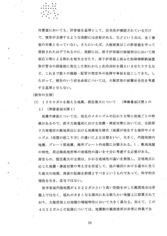 26. 26. .〆 -・.-・・ ..-・・・...• •• • • • • .... -・ . 性審査においても,許容値を基準として,安全性が確認されているだけ で,被告が主張するような実際には余裕がある,などという点は,全く審 査の対象となっていない。さらにいえば,大飯原発はこの許容値を守って 建設されたはずであるのに,実際には,原子炉容器の溶接部分において残 留応力等による割れを発生させたり,原子炉容器上部ふた制御棒駆動装置 取付管台の溶接部に発生した割れから 1次冷却材を漏えいさせたりするな ど,これまで数々の機器・配管の想定外の故障や事故を起こしてきた。し たがって,被告のいう安全余裕については,大飯原発の耐震安全性を考慮 する基準とならない。 (被告の主張) (1) 1260ガルを超える地震,既往最大について 〈準備書面(3)第 1の 1) <準備書面(4)第1) 地震や津波については,発生のメカニズムや伝わり方等に地域ごとの特 徴があるので,原子力発電所における地震・津波対策においては,当該原 子力発電所の敷地周辺における地震発生様式(地震が発生する場所やメカ ニズム(地震の起こり方)の違いによる分類をいい,大きく,内陸地殻内 地震,プレート問地震,海洋プレート内地震に分類される。) ,敷地地盤 の特性,周辺海底地形等の地域性の違いを十分に考慮する必要がある。 原告らの,既往最大の主張は,かかる地域性の違いを無視し,立地地点に 応じた地震・津波対策の考え方を否定して,他の場所における過去に生じ た最大の地震,津波の記録を前提とすべきというものであって,科学的合 理性を欠き,妥当ではない。 岩手宮城内陸地震が 4 0 2 2ガルという高い記録を示した観測地点は岩 盤上ではなく,揺れの大きくなる傾向にある軟らかい地盤上に設置されて おり,大飯原発とは地盤の増幅特性において大きく異なる。加えて,この 4022ガルとの記録については,地震動の観測波形が非常に特異であ 26