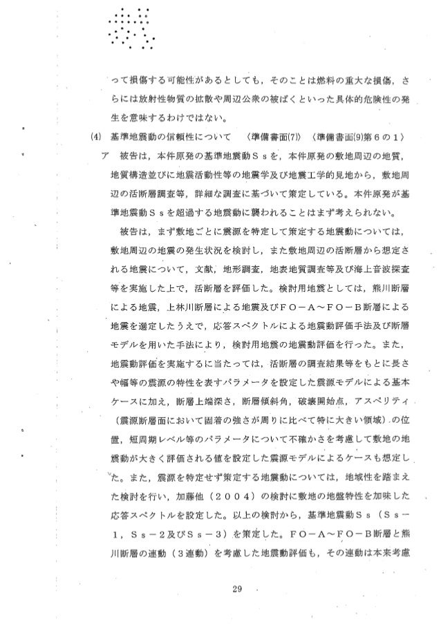 29. 29. • •• ・..CI" -・....0 • •..• • • .... -・. って損傷する可能性があるとしても,そのことは燃料の重大な損傷,さ らには放射性物質の拡散や周辺公衆の被ばくといった具体的危険性の発 生を意味するわけではない。 (4) 基準地震動の信頼性について (準備書面(7)) (準備書面(9)第 6の 1) ア 被告は,本件原発の基準地震動 S sを,本件原発の敷地周辺の地質, 地質構造並びに地震活動性等の地震学及び地震工学的見地から,敷地周 辺の活断層調査等,詳細な調査に基づいて策定している。本件原発が基 準地震動 S sを超過する地震動に襲われることはまず考えられない。 被告は,まず敷地ごとに震源を特定して策定する地震動については, 敷地周辺の地震の発生状況を検討し,また敷地周辺の活断層から想定さ れる地震について,文献,地形調査,地表地質調査等及び海上音波探査 等を実施した上で,活断層を評価した。検討用地震としては,熊川断層 による地震,上林川断層による地震及び FO-A~FO-B 断層による 地震を選定したうえで,応答スペクトルによる地震動評価手法及び断層 モデルを用いた手法により,検討用地震の地震動評価を行った。また, 地震動評価を実施するに当たっては,活断層の調査結果等をもとに長さ や幅等の震源の特性を表すパラメータを設定した震源、モデ、ルによる基本 ケースに加え,断層上端深さ,断層傾斜角,破壊開始点,アスペリティ (震源、断層面において固着の強さが周りに比べて特に大きい領域)-の位 置,短周期レベ/レ等のパラメータについて不確かさを考慮、して敷地の地 震動が大きく評価される値を設定した震源モデルによるケースも想定し vた。また,震源を特定せず策定する地震動については,地域性を踏まえ た検討を行い,加藤他 (2004) の検討に敷地の地盤特性を加味した 応答スペクトルを設定した。以上の検討から,基準地震動 Ss (Ss- 1, S s- 2及び S s- 3) を策定した。 FO-A~FO-B 断層と熊 川 断 層 の 連 動 (3連動)を考慮した地震動評価も,その連動は本来考慮、 29