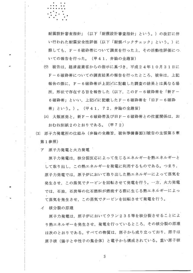 3. 3. " M ~ ••・ ・・ .••••••••• . .• • •••。•••• ・ -・. 耐震設計審査指針J (以下「耐震設計審査指針」という。)の改訂に伴 い行われた耐震安全性評価(以下「耐震ノ〈ックチェック」という。)に 際しでも, F -6破砕帯について調査を行った上,その活動性評価につ いての報告を行った。(甲 41,弁論の全趣旨) (ウ) 被告は,経済産業省からの指示に基づき,平成 24年 10月 31日に F-6破砕帯についての調査結果の報告を行ったところ,被告は,上記 報告の際に, F -6破砕帯が上記刊に記載した調査の結果とは異なる場 所,形状で存在する旨を報告した(以下,この F-6破砕帯を「新 F - 6破砕帯」といい,上記付)に記載した F-6破砕帯を「旧 F-6破 砕 帯」という。) 0 (甲 41, 72,弁論の全趣旨) (エ) 大飯原発と,新 F-6破砕帯及び旧 F-6破砕帯との位置関係は,お おむね別紙 2のとおりである。(甲 72) (3) 原子力発電所の仕組み(弁論の全趣旨,被告準備書面(1)被告の主張第 5章 第 1参照) ア 原子力発電と火力発電 原子力発電は,核分裂反応によって生じるエネルギーを熱エネルギーと して取り出し,この熱エネルギーを発電に利用するものである。つまり, 原子力発電では,原子炉において取り出した熱エネルギーによって蒸気を 発生させ,この蒸気でタービンを回転させて発電を行う。一方,火力発電 では,石油,石炭等の化石燃料が燃焼する際に生じる熱エネルギーによっ て蒸気を発生させ,この蒸気でタービンを回転させて発電を行う。 イ 核分裂の原理 原子力発電は,原子炉においてウラン 235等を核分裂させることによ り熱エネルギーを発生させ,発電を行っているところ,その核分裂の原理 は次のとおりである。すべての物質は,原子から成り立っており,原子は 原子核(陽子と中性子の集合体)と電子から構成されている。重い原子核 3