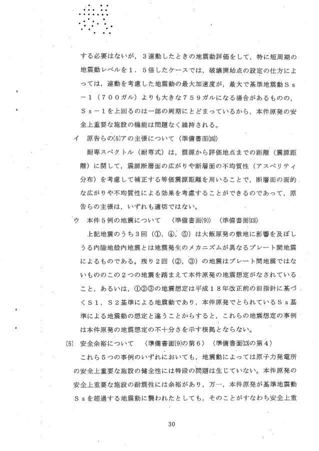 30. 30. • 包 • •• ・.. .. ・・・...e • •..• • • • • .. -・ . する必要はないが, 3連動したときの地震動評価をして,特に短周期の 地震動レベルを1. 5倍したケースでは,破壊開始点の設定の仕方によ っては,連動を考慮、した地震動の最大加速度が,最大で基準地震動 ss -1 (700ガル)よりも大きな 759ガルになる場合があるものの, ss- 1を上回るのは一部の周期にとどまっているから,本件原発の安 全上重要な施設の機能は問題なく維持される。 イ 原告らの(5)アの主張について(準備書面(16)) 耐専スペクトル(耐専式)は,震源から評価地点までの距離(震源、距 離)に関して,震源断層面の広がりや断層面の不均質性(アスペリティ 分布)を考慮して補正する等価震源距離を用いることで,断層面の面的 な広がりや不均質性による効果を考慮することができるのであって,原 告らの主張は,いずれも適切ではない。 ウ 本件 5例の地震について 〈準備書面(9)) <準備書面(日)) 上記地震のうち 3回(①,④,⑤)は大飯原発の敷地に影響を及ぼし うる内陸地殻内地震とは地震発生のメカニズムが異なるプレート問地震 によるものである。残り 2回(②,③)の地震はプレート問地震ではな いもののこの 2つの地震を踏まえて本件原発の地震想定がなされている こと,あるいは,①②③の地震想定は平成 18年 改E前の旧指針に基づ くS1, S2基準による地震動であり,本件原発でとられている Ss基 準による地震動の想定と違うことからすると,これらの地震想定の事例 は本件原発の地震想定の不十分さを示す根拠とならない。 (5) 安全余裕について (準備書面(9)の第 6) <準備書面(13)の第 4) これら 5つの事例のいずれにおいても,地震動によっては原子力発電所 の安全上重要な施設の健全性には特段の問題は生じていない。本件原発の 安全上重要な施設の耐震性には余裕があり,万一,本件原発が基準地震動 S sを超過する地震動に襲われたとしても,そのことがすなわち安全上重 30