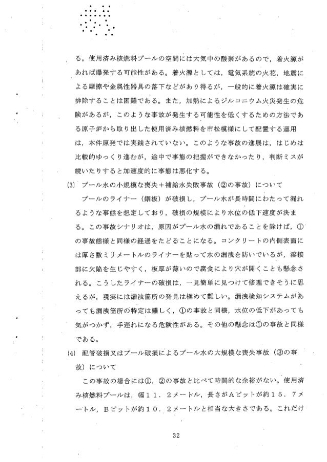 32. 32. .・. ・・ .•••••••• •• • ・...•• • . • •• る。使用済み核燃料プールの空間には大気中の酸素があるので,着火源が あれば爆発する可能性がある。着火源としては,電気系統の火花,地震に よる摩擦や金属性器具の落下などがあり得るが,一般的に着火源は確実に 排除することは困難である。また,加熱によるジルコニウム火災発生の危 険があるが,このような事故が発生する可能性を低くするための方法であ る原子炉から取り出した使用済み核燃料を市松模様にして配置する運用 は,本件原発では実践されていない。このような事故の進展は,はじめは 比較的ゆっくり進むが,途中で事態の把握ができなかったり,判断ミスが 続いたりすると加速度的に事態は悪化する。 (3) プール水の小規模な喪失+補給水失敗事故(②の事故)について プールのライナー(鋼板)が破損し,プール水が長時間にわたって漏れ るような事態を想定しており,破損の規模により水位の低下速度が決ま る。この事故シナリオは,原因がプール水の漏れであることを除けば,① l の事故態様と同様の経過をたどる一ことになる。コンクリートの内側表面に は厚さ数ミリメートルのライナーを貼って水の漏洩を防いでいるが,溶接 部に欠陥を生じやすく,板厚が薄いので腐食により穴が開くことも懸念さ れる。こうしたライナーの破損は,一見簡単に見つけて修理できそうに思 えるが,現実には漏洩箇所の発見は極めて難しい。漏洩検知システムがあ っても漏洩箇所の特定は難しく,①の事故と同様,水位の低下があっても 気がつかず,手遅れになる危険性がある。その他の懸念は①の事故と同様 である。 (4) 配管破損又はプール破損によるプール水の大規模な喪失事故(③の事 故)について この事故の場合には①,②の事故と比べて時間的な余裕がない。使用済 み核燃料プールは,幅 11. 2メートル,長さが Aピットが約 15. 7メ ートノレ, Bピットが約 10. 2メートルと相当な大きさである。これだけ 32