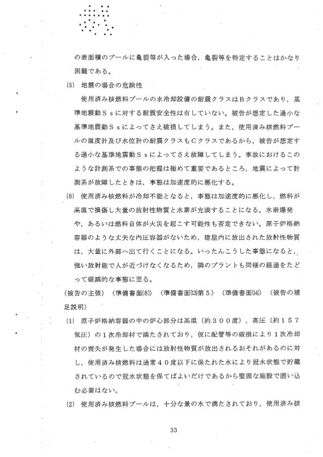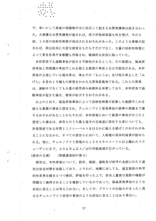 37. 37. ..-・・ ..-・・..... .... .... ...• • ず,幸いにして高温の溶融物が水に反応して起きる水蒸気爆発は起きなかっ た。大規模な水蒸気爆発が起きれば,原子炉格納容器も吹き飛び,今の 5 倍, 10倍の放射性物質が放出されるおそれがあった。このような事態が起 きれば,周辺住民に大変な被害をもたらすだけでなく,大量の放射性物質に よって東北各県や首都圏も汚染され,破滅的な状況に陥っていた。 本件原発でも過酷事故が起きる可能性があるところ,その規模は,福島原 発事故と同規模の事故やこれを超える最悪の事故となる可能性がある。本件 原発が立地している福井県は,停止中の「もんじ.ゆ J及び恒久停止した「ふ げん」を含め 15機もの原発をかかえる原発密集地である。これらの原発 は,運転中でなくても大量の使用済み核燃料を保管しており,本件原発で過 酷事故が起きた場合,被害が拡大するおそれがある。 以上のとおり,福島原発事故によって放射性物質が拡散した範囲やこれを 超える最悪の事故も想定され,チェルノブイリ原発事故の被害の規模まで達 するおそれがあることからすれば,本件原発において最悪の事故が生じたと 想定した場合は,原告らのうち最も遠方の北海道に居住する者についても, 許容限度である年間 1ミリシーベルトをはるかに超える被ぱくのおそれがあ ることになるから,すべての原告らにおいて,人格権の具体的侵害が認めら れる。現に,チェルノブイリ原発から 1500キロメートル以上離れたスウ ェーデンにまで, 40kBq以上/niの汚染地域が広がっている。 (被告の主張) <準備書面(お)の第 4) 被告は,本件原発について,設計,建設,運転及び保守の全般にわたり適 切な安全対策を実施しており,とりわけ,地震に対しでも,適宜最新の科学 的知見等を踏まえつつ検討,評価を行った上で,安全上重要な施設の機能が 問題なく維持されることを確認しているのであって,福島原発事故のような 状況に至ることは考えられない。ましてや,プラントの仕組みがまったく異 なるチエノレゾブイリ原発の事故のような状況に至ることはあり得ない。 37