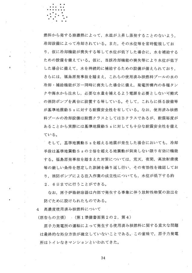 34. 34. • -・.・・・ ・......... . •• .. .... •.• • -・ . 燃料から発する崩壊熱によって,水温が上昇し蒸発することのないよう, 冷却設備によって冷却されている。また,その水位等を常時監視してお り,仮に冷却機能が喪失する等して水位が低下した場合に, 7}cを補給する ための設備を備えている。仮に,当該冷却機能の喪失等により水位が低下 した場合に備えて, 7}cを持続的に補給するための設備が備えられており, さらには,福島原発事故を踏まえ,これらの使用済み核燃料プールの水の 冷却・補給機能が万一同時に喪失した場合に備え,発電所構内の各種タン クや海水から注水し,必要な水量を補えるよう電源を必要としない可搬式 の消防ポンプを高台に設置する等している。そして,これらに係る設備等 が基準地震動 ssに対する耐震安全性を有している。なお,使用済み核燃 料プールの冷却設備は耐震クラスとしては Bクラスであるが,耐震裕度が あることから実際には基準地震動 ssに対しでも十分な耐震安全性を備え ている。 そして,基準地震動 ssを超える地震が発生した場合においても,冷却 手段は基準地震動 S $の 2 倍を超える地震動が到来しない限り有効 ~':I機能 する。福島原発事故を踏まえた対策については,荒天,夜間,高放射環境 等の厳しい条件を想定した訓練を繰り返し行い,その有効性を確認してお り,消防ポンプによる注入作業の成立性についても,水位が低下する約 2. 6日までに行うことができる。 なお,原子炉格納容器は内部で発生する事象に伴う放射性物質の放出を 防ぐために設けられたものである。 4 高濃度使用済み核燃料について (原告らの主張) • (第 1準備書面第 2の 2,第 4) 原子力発電所の運転によって発生する使用済み核燃料に関する重大な問題 は最終的な処分方法が確立していないことである。この意味で,原子力発電 所はトイレなきマンションといわれてきた。 34
