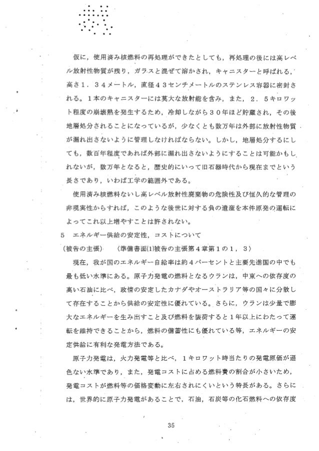 35. 35. 5 -・...~ ..・・・・... ・.• •・ ..・・ .•• • ・.. 仮に,使用済み核燃料の再処理ができたとしても, 再処理の後には高レベ ノレ放射性物質が残り, ガラスと混ぜて溶かされ, キャニスターと呼ばれる, 高さ 1. 34メートル,直径 43センチメートルのステンレス容器に密封さ れる。 1本のキャニスターには莫大な放射能を含み, また, 2. 5キロワッ ト程度の崩壊熱を発生するため,冷却しながら 30年ほど貯蔵され, その後 地層処分されることになっているが, 少なくとも数万年は外部に放射性物質. が漏れ出さないように管理しなければならない。 しかし, 地層処分するにし ても,数百年程度であれば外部に漏れ出さないようにすることは可能かもし れないが,数万年となると, 歴史的にいって旧石器時代から現在までという 長さであり, いわば工学の範囲外である。 使用済み核燃料ないし高レベル放射性廃棄物の危険性及び恒久的な管理の 非現実性からすれば, このような後世に対する負の遺産を本件原発の運転に よってこれ以上増やすことは許されない。 エネルギー供給の安定性, コストについて (被告の主張) (準備書面(1)被告の主張第 4章第 1の 1, 3) 現在, 我が国のエネルギー自給率は約 4パーセントと主要先進国の中でも 最も低い水準にある。原子力発電の燃料となるウランは, 中東への依存度の 高い石油に比べ,政情の安定したカナダやオーストラリア等の国々に分散し て存在することから供給の安定性に優れている。 さらに, ウランは少量で膨 大なエネルギーを生み出すこと及び燃料を装荷すると 1年以上にわたって運 転を維持できることから,燃料の備蓄性にも優れている等, エネルギーの安 定供給に有利な発電方法であ石。 原子力発電は,火力発電等と比べ, 1キロワット時当たりの発電原価が遜 色ない水準であり,また, 発電コストに占める燃料費の割合が小さいため, 発電コストが燃料等の価格変動に左右されにくいという特長がある。 さらに は,世界的に原子力発電があることで, 石油, 石炭等の化石燃料への依存度 35