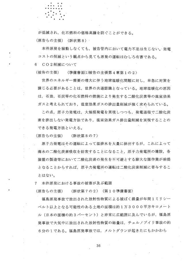 36. 36. -!・- -l ・ ••• ••••••••••••• •• •..・... が低減され,化石燃料の価格高騰を防ぐことができる。 (原告らの主張) <訴状第 8) 本件原発を稼動しなくても,被告管内において電力不足は生じない。発電 コストの削減という観点から見ても原発の運転はむしろ有害である。 6 C02削減について (被告の主張) <準備書面(1)被告の主張第 4章第 1の 2) 世界のエネルギー需要の増大に伴う地球温暖化問題に対し,早急に対策を 講じる必要があることは,世界の共通認識となっている。地球混暖化の原因 は,石油,石炭等の化石燃料の燃焼により発生する二酸化炭素等の温室効果 ガスと考えられており,温室効果ガスの排出量削減が強く求められている。 この点,原子力発電は,大規模発電を実現しつつも,発電過程で二酸化炭 素を排出しない発電方法であり,温室効果ガス排出量削減を実現することの できる発電方法といえる。 (原告らの主張) <訴状第 8の7) 原子力発電はその運転によって温排水を大量に排出するが,これによって 海水の二酸化炭素吸収を妨害することになること,原子力発電所の建設,各 装置の製造等において三酸化炭素の発生を不可避とする膨大な諸作業が前提 となることからすれば,原子力発電所の運転は二酸化炭素削減に寄与するこ とはない。 7 本件原発における事故の被害が及ぶ範囲 (原告らの主張) <訴状第 7の 2) <第 10準備書面〉 福島原発事故で放出された放射性物質による被ばく線量が年間 1ミリシー ベルト以上となる可能性のある土地の面積は約 1万 3000平方キロメート ル(日本の面積の約 3パーセント)と非常に広範囲に及んで、いるが,福島原 発事故で大気中に放出された放射性物質の総量は,チェルノブイリ事故の約 6分の 1である。福島原発事故では,メルトダウンが起きたにもかかわら 36