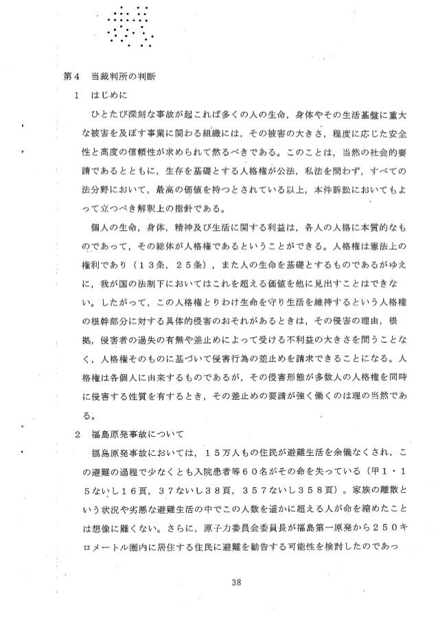 38. 38. .• • -・........... .• .... ... . • • 第 4 当裁判所の判断 l はじめに ひとたび深刻!な事故が起これば多くの人の生命,身体やその生活基盤に重大 な被害を及ぼす事業に関わる組f織には,その被害の大きさ,程度に応じた安全 性と高度の信頼性が求められて然るべきである。このことは,当然の社会的要 請であるとともに,生存を基礎とする人格権が公法,私法を問わず,すべての 法分野において,最高の価値を持つとされている以上,本件訴訟においてもよ って立つべき解釈上の指針である。 個人の生命,身体,精神及び生活に関する利益は,各人の人格に本質的なも のであって,その総体が人格権であるということができる。人格権は憲法上の 権利であり (13条, 25条) ,また人の生命を基礎とするものであるがゆえ に,我が国の法制下においてはこれを超える価値を他に見出すことはできな い。したがって,この人格権とりわけ生命を守り生活を維持するという人格権 の根幹部分に対する具体的侵害のおそれがあるときは,その侵害の理由,根 拠,侵害者の過失の有無や差止めによって受ける不利益の大きさを問うことな く,人格権そのものに基づいて侵害行為の差止めを請求できること仁なる。人 格権は各個人に由来するものであるが,その侵害形態が多数人の人格権を同時 に侵害する性質を有するとき,その差止めの要請が強く働くのは理の当然であ る。 2 福島原発事故について 福島原発事故においては, 15万人もの住民が避難生活を余儀なくされ,こ の避難の過程で少なくとも入院患者等 60名がその命を失っている(甲 1 ・1 5ないし 16頁, 37ないし 38頁, 357ないし 358頁)。家族の離散と いう状況や劣悪な避難生活の中でこの人数を遥かに超える人が命を縮めたこと は想像に難くない。さらに,原子力委員会委員長が福島第一原発から 250キ ロメートル圏内に居住する住民に避難を勧告する可能性を検討したのであっ 38