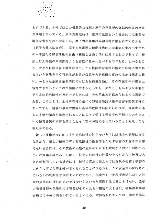 40. 40. • -・.. . . . c' f' -一・・.・・.• •• •. ・ 'e・ 4 ・ a・" . ・.・ とができる。本件ではこの根源的な権利と原子力発電所の運転の利益の調整 が問題となっている。原子力発電所は,電気の生産という社会的には重要な 機能を営むものではあるが,原子力の利用は平和目的に限られているから (原子力基本法 2条) 原子力発電所の稼動は法的には電気を生み出すため の一手段たる経済活動の自由 (憲法 22条 1項)に属するものであって, 憲 法上は人格権の中核部分よりも劣位に置かれるべきものである。 しかるとこ ろ, 大きな自然災害や戦争以外で, この根源的な権利が極めて広汎に奪われ るという事態を招く可能性があるのは原子力発電所の事故のほかは想定し難 し、。 かような危険を抽象的にでもはらむ経済活動は, その存在自体が憲法上 容認できないというのが極論にすぎるとしても, 少なくともかような事態を その差止めが認められるのは当然で招く具体的危険性が万が一でもあれば, ある。 このことは, 土地所有権に基づく妨害排除請求権ヤ妨害予防請求権に おいてすら, 侵害の事実や侵害の具体的危険性が認められれば, 侵害者の過 失の有無や請求が認容されることによって受ける侵害者の不利益の大きさと いう侵害者側の事情を問うことなく請求が認められていることと対比しでも 明らかである。 新しい技術が潜在的に有する危険性を許さないとすれば社会の発展はなく なるから,新しい技術の有する危険性の性質やもたらす被害の大きさが明確 でない場合には3 その技術の実施の差止めの可否を裁判所において判断する ことは困難を極める。 しかし,技術の危険性の性質やそのもたらす被害の大 きさが判明している場合には,技術の実施に当たっては危険の性質と被害の 大きさに応じた安全性が求められることになるから, この安全性が保持され ているかの判断をすればよいだけであり, 危険性を一定程度容認しないと社 会の発展が妨げられるのではないかといった葛藤が生じることはない。原子 力発電技術の危険性の本質及びそのもたらす被害の大きさは,福島原発事故 を通じて十分に明らかになったといえる。本件訴訟においては,本件原発に 40