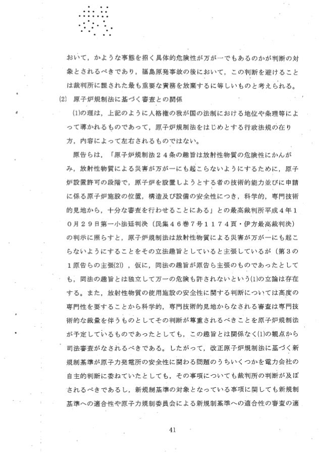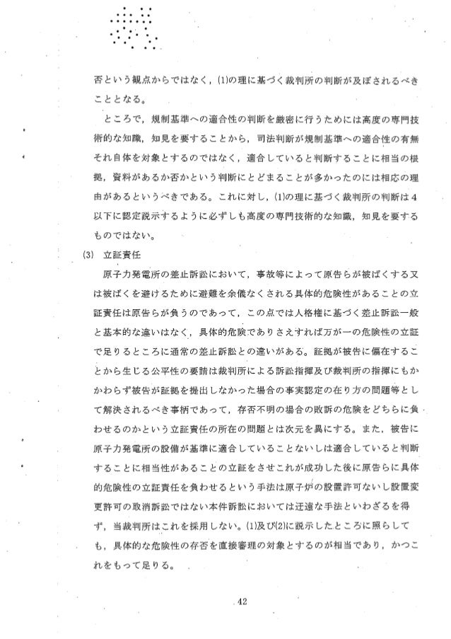 42. 42. ぜ (3) • •• ・・・ .........・ .• •・ ..•• •• .・・.. 否という観点からではなく, (1)の理に基づく裁判所の判断が及ぼされるべき こととなる。 ところで,規制基準への適合性の判断を厳密に行うためには高度の専門技 術的な知識, 知見を要することから, 司法判断が規制基準への適合性の有無 それ自体を対象とするのではなく,適合していると判断することに相当の根 拠,資料があるか否かという判断にとどまることが多かったのには相応の理 由があるというべきである。 これに対し, (1)の理に基づく裁判所の判断は 4 以下に認定説示するように必ずしも高度の専門技術的な知識, 知見を要する ものではない。 立証責任 原子力発電所の差止訴訟において,事故等によって原告らが被ばくする又 は被ぱくを避けるために避難を余儀なくされる具体的危険性があることの立 証責任は原告らが負うのであって,この点では人格権に基づく差止訴訟一般 と基本的な違いはなく, 具体的危険だありさえすれば万が一の危険性の立証 で足りるところに通常の差止訴訟との違いがある。証拠が被告に偏在するこ とから生じる公平性の要請は裁判所による訴訟指揮及び裁判所の指揮にもか かわらず被告が証拠を提出しなかった場合の事実認定の在り方の問題等とし て解決されるべき事柄であって,存否不明の場合の敗訴の危険をどちらに負 わせるのかという立証責任の所在の問題とは次元を異にする。 また,被告に 原子力発電所の設備が基準に適合していることないしは適合していると判断 することに相当性があることの立証をさせこれが成功した後に原告らに具体 的危険性の立証責任を負わせるという手法は原子炉の設置許可ないし設置変 更許可の取消訴訟ではない本件訴訟においては迂速な手法といわざるを得 ず, 当裁判所はこれを採用しない。 (1)及び(2)に説示したところ1に照らして も, 具体的な危険性の存否を直接審理の対象とするのが相当であり, かっこ れをもって足りる。 42