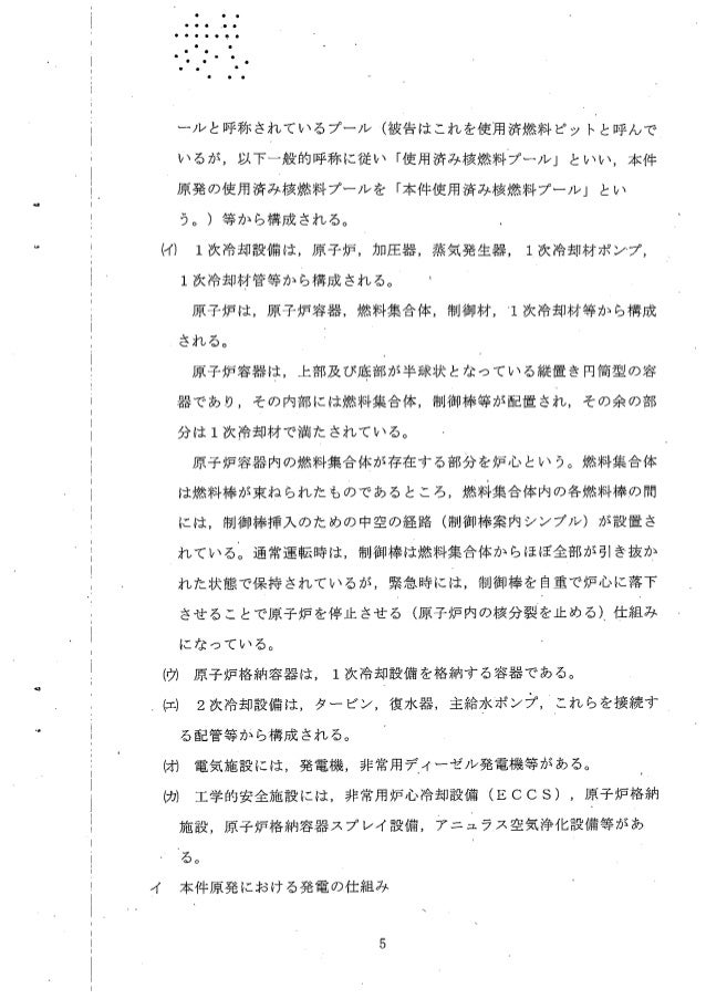 5. 5. 輔 情 ‘' -・.......-・・..e e • •• • ..・・ ..• •• ールと呼称されているプール(被告はこれを使用済燃料ピットと呼んで いるが,以下一般的呼称に従い「使用済み核燃料プール」といい,本件 原発の使用済み核燃料プールを「本件使用済み核燃料プール」とい う。)等から構成される。 付) 1次冷却設備は,原子炉,加圧器,蒸気発生器, 1次冷却材ポンプ, 1次冷却材管等から構成される。 原子炉は,原子炉容器,燃料集合体,制御材, "1次冷却材等から構成 される。 原子炉容器は,上部及び底部が半球状となっている縦置き円筒型の容 器であり,その内部には燃料集合体,制御棒等が配置され,その余の部 分は 1次冷却材で満たされている。 原子炉容器内の燃料集合体が存在する部分を炉心という。燃料集合体 は燃料棒が束ねられたものであるところ,燃料集合体内の各燃料棒の聞 には,制御棒挿入のための中空の経路(制御棒案内シンプル)が設置さ れている。通常運転時は,制御棒は燃料集合体からほぼ全部が引き抜か れた状態で保持されているが,緊急時には,制御棒を自重で炉心に落下 させることで原子炉を停止させる(原子炉内の核分裂を止める)仕組み になっている。 (ウ) 原子炉格納容器は, 1次冷却設備を格納する容器である。 (ヱ) 2次冷却設備は,タービン,復水器,主給水ポンプ,これらを接続す る配管等から構成される。 (オ) 電気施設には,発電機,非常用ディーゼル発電機等がある。 (カ) 工学的安全施設には,非常用炉心冷却設備 (ECCS) ,原子炉格納 施設,原子炉格納容器スプレイ設備,アニュラス空気浄化設備等があ る。 イ 本件原発における発電の仕組み 5