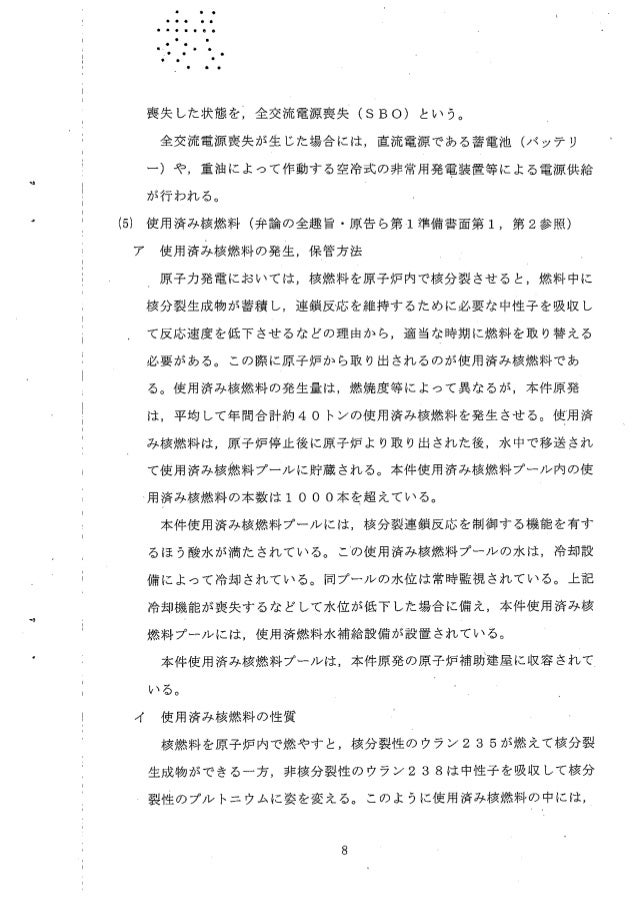 8. 8. ~ ー., -・......・・...e _ • •• •. ..・. ...・• •• 喪失した状態を,全交流電源喪失 (SB0) という。 全交流電源喪失が生じた場合には,直流電源である蓄電池(バッテリ 一)や,重油によって作動する空冷式の非常用発電装置等による電源供給 が行われる。 (5) 使用済み核燃料(弁論の全趣旨・原告ら第 1準備書面第 1,第 2参照) ア 使用済み核燃料の発生,保管方法 原子力発電においては,核燃料を原子炉内で核分裂させると,燃料中に 核分裂生成物が蓄積し,連鎖反、応を維持するために必要な中性子を吸収し て反応速度を低下させるなどの理由から,適当な時期に燃料を取り替える 必要がある。この際に原子炉から取り出されるのが使用済み核燃料であ る。使用済み核燃料の発生量は,燃焼度等によって異なるが,本件原発 は,平均して年間合計約 40トンの使用済み核燃料を発生させる。使用済 み核燃料は,原子炉停止後に原子炉より取り出された後,水中で移送され て使用済み核燃料プールに貯蔵される。本件使用済み核燃料プール内の使 用済み核燃料の本数は 1000本を超えている。 本件使用済み核燃料プールには,核分裂連鎖反応を制御する機能を有す るほう酸水が満たされている。この使用済み核燃料プールの水は,冷却設 備によって冷却されている。同プールの水位は常時監視されている。上記 冷却機能が喪失するなどして水位が低下した場合に備え,本件使用済み核 燃料プールには,使用済燃料水補給設備が設置されている。 本件使用済み核燃料プーノレは,本件原発の原子炉補助建屋に収容されで いる。 イ 使用済み核燃料の性質 核燃料を原子炉内で燃やすと,核分裂性のウラン 235が燃えて核分裂 生成物ができる一方,非核分裂性のウラン 238は中性子を吸収して核分 裂性のプルトニワムに姿を変える。このように使用済み核燃料の中には, 8