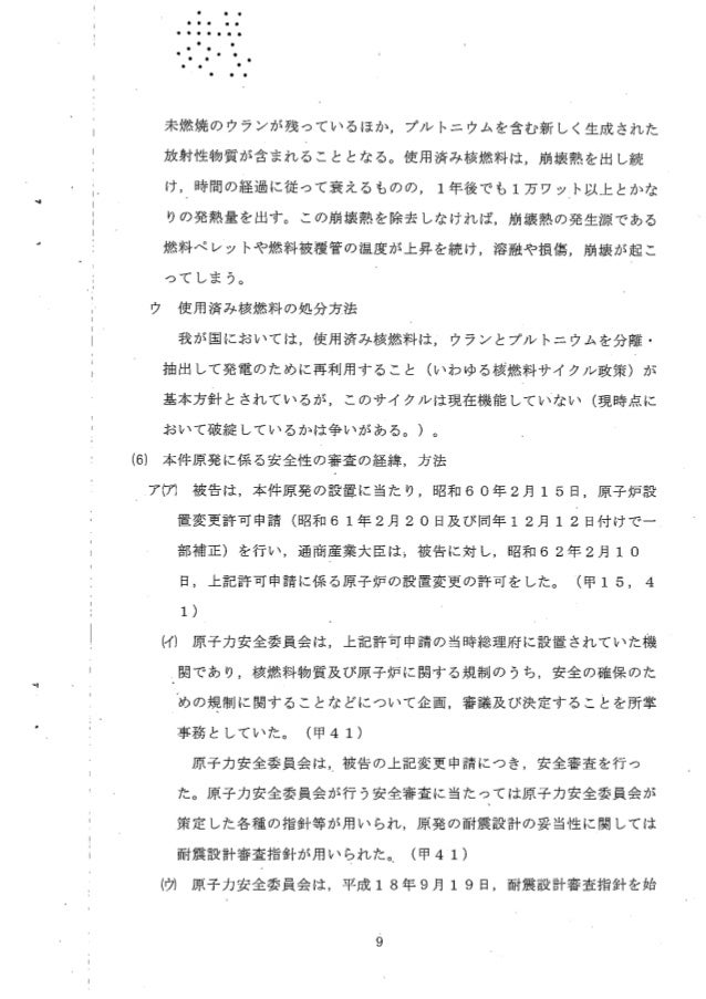 9. 9. 、a 吋 ・3 • •• -・・ ..-・・..e _ • •• •. ..••••• •••・ 未燃焼のウランが残っているほか,プルトニウムを含む新しく生成された 放射性物質が含まれることとなる。使用済み核燃料は,崩壊熱を出し続 け,時間の経過に従って衰えるものの, 1年後でも 1万ワット以上とかな りの発熱量を出す。この崩壊熱を除去しなければ,崩壊熱の発生源である 燃料べレットや燃料被覆管の温度が上昇を続け,溶融や損傷,崩壊が起こ ってしまう。 ウ 使用済み核燃料の処分方法 我が国においては,使用済み核燃料は,ウランとプルトニウムを分離・ 抽出して発電のために再利用すること(し、わゆる核燃料サイクル政策)が 基本方針とされているが,このサイクルは現在機能していない(現時点に おいて破綻しているかは争いがある。)。 (6) 本件原発に係る安全性の審査の経緯,方法 ア(対被告は,本件原発の設置に当たり,昭和 60年 2月 15日,原子炉設 置変更許可申請(昭和 61年 2月 20日及び同年 12月 12日付けで一 部補正)を行い,通商産業大臣は,被告に対し,昭和 62年 2月 10 日,上記許可申請に係る原子炉の設置変更の許可をした。(甲 15, 4 1) 付) 原子力安全委員会は,上記許可申請の当時総理府に設置されていた機 関であり,核燃料物質及び原子炉に関する規制のうち,安全の確保のた めの規制に関することなどについて企画,審議及び決定することを所掌 事務としていた。(甲 41) 原子力安全委員会は,被告の上記変更申請につき,安全審査を行っ た。原子力安全委員会が行う安全審査に当たっては原子力安全委員会が 策定した各種の指針等が用いられ,原発の耐震設計の妥当性に関しては 耐震設計審査指針が用いられた。(甲 41) (功 原子力安全委員会は,平成 18年 9月 19日,耐震設計審査指針を始 9