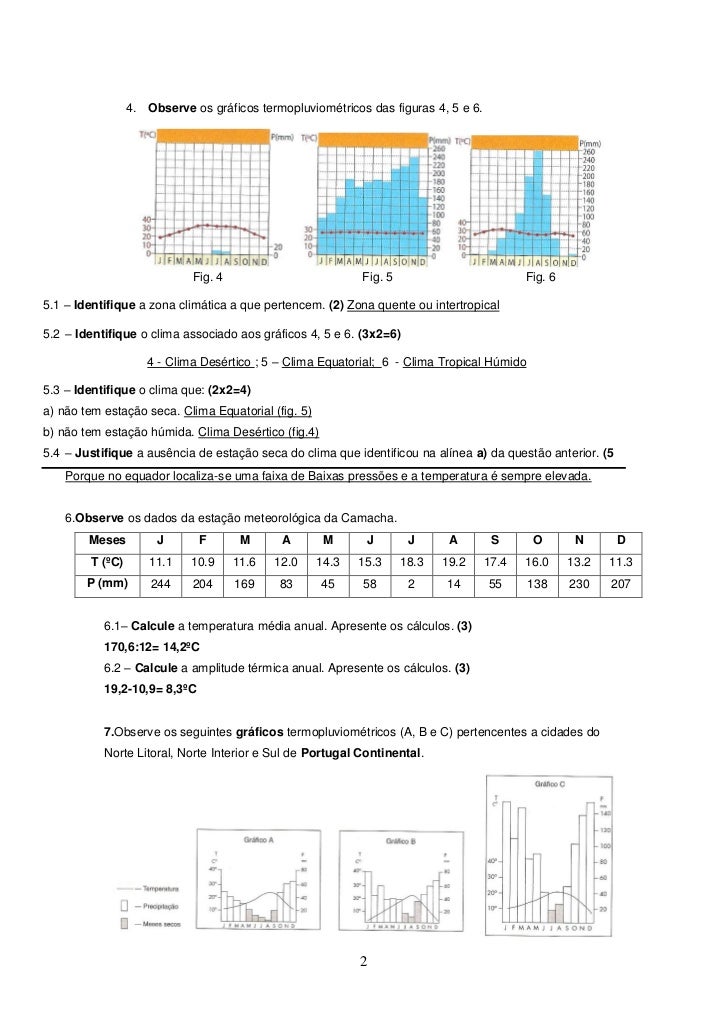 2. 2. 4. Observe os gráficos termopluviométricos das figuras 4, 5 e 6. Fig. 4 Fig. 5 Fig. 65.1 – Identifique a zona climática a que pertencem. (2) Zona quente ou intertropical5.2 – Identifique o clima associado aos gráficos 4, 5 e 6. (3x2=6) 4 - Clima Desértico ; 5 – Clima Equatorial; 6 - Clima Tropical Húmido5.3 – Identifique o clima que: (2x2=4)a) não tem estação seca. Clima Equatorial (fig. 5)b) não tem estação húmida. Clima Desértico (fig.4)5.4 – Justifique a ausência de estação seca do clima que identificou na alínea a) da questão anterior. (5 Porque no equador localiza-se uma faixa de Baixas pressões e a temperatura é sempre elevada. 6.Observe os dados da estação meteorológica da Camacha. Meses J F M A M J J A S O N D T (ºC) 11.1 10.9 11.6 12.0 14.3 15.3 18.3 19.2 17.4 16.0 13.2 11.3 P (mm) 244 204 169 83 45 58 2 14 55 138 230 207 6.1– Calcule a temperatura média anual. Apresente os cálculos. (3) 170,6:12= 14,2ºC 6.2 – Calcule a amplitude térmica anual. Apresente os cálculos. (3) 19,2-10,9= 8,3ºC 7.Observe os seguintes gráficos termopluviométricos (A, B e C) pertencentes a cidades do Norte Litoral, Norte Interior e Sul de Portugal Continental. 2