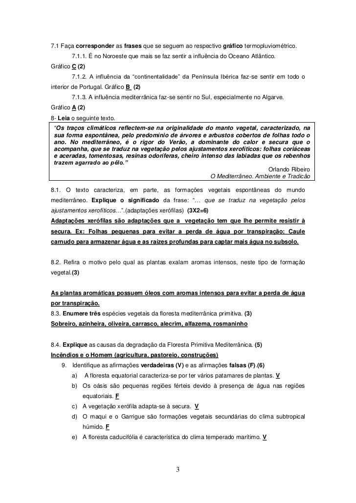 3. 3. 7.1 Faça corresponder as frases que se seguem ao respectivo gráfico termopluviométrico. 7.1.1. É no Noroeste que mais se faz sentir a influência do Oceano Atlântico.Gráfico C (2) 7.1.2. A influência da “continentalidade” da Península Ibérica faz-se sentir em todo ointerior de Portugal. Gráfico B (2) 7.1.3. A influência mediterrânica faz-se sentir no Sul, especialmente no Algarve.Gráfico A (2)8- Leia o seguinte texto. “Os traços climáticos reflectem-se na originalidade do manto vegetal, caracterizado, na sua forma espontânea, pelo predomínio de árvores e arbustos cobertos de folhas todo o ano. No mediterrâneo, é o rigor do Verão, a dominante do calor e secura que o acompanha, que se traduz na vegetação pelos ajustamentos xerofíticos: folhas coriáceas e aceradas, tomentosas, resinas odoríferas, cheiro intenso das labiadas que os rebenhos trazem agarrado ao pêlo.” Orlando Ribeiro O Mediterrâneo, Ambiente e Tradição8.1. O texto caracteriza, em parte, as formações vegetais espontâneas do mundomediterrâneo. Explique o significado da frase: “… que se traduz na vegetação pelosajustamentos xerofíticos…”.(adaptações xerófilas) (3X2=6)Adaptações xerófilas são adaptações que a vegetação tem que lhe permite resistir àsecura. Ex: Folhas pequenas para evitar a perda de água por transpiração; Caulecarnudo para armazenar água e as raízes profundas para captar mais água no subsolo.8.2. Refira o motivo pelo qual as plantas exalam aromas intensos, neste tipo de formaçãovegetal.(3)As plantas aromáticas possuem óleos com aromas intensos para evitar a perda de águapor transpiração.8.3. Enumere três espécies vegetais da floresta mediterrânica primitiva. (3)Sobreiro, azinheira, oliveira, carrasco, alecrim, alfazema, rosmaninho8.4. Explique as causas da degradação da Floresta Primitiva Mediterrânica. (5)Incêndios e o Homem (agricultura, pastoreio, construções) 9. Identifique as afirmações verdadeiras (V) e as afirmações falsas (F).(6) a) A floresta equatorial caracteriza-se por ter vários patamares de plantas. V b) Os oásis são pequenas regiões férteis devido à presença de água nas regiões equatoriais. F c) A vegetação xerófila adapta-se à secura. V d) O maqui e o Garrigue são formações vegetais secundárias do clima subtropical húmido. F e) A floresta caducifólia é característica do clima temperado marítimo. V 3