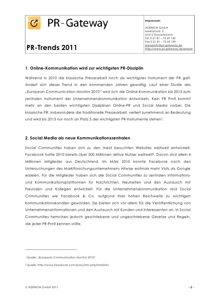 1. 1. Impressum: ADENION GmbH Merkatorstr. 2 41515 Grevenbroich Tel. 0 21 81 – 75 69 140 Fax 0 21 81 – 75 69 199 PR-Trends 2011 presseinfo@pr-gateway.de http://www.pr-gateway.de/presse PR-Trends 2011: 10 Trends für die Öffentlichkeitsarbeit 2.0 im Social Media Zeitalter Die Public Relations Branche ist im Umbruch. Die klassische Pressearbeit hat ausgedient. Die Auflagen der Printmedien befinden sich im kontinuierlichen Sinkflug. Auch der Einfluss von TV und Radio schwindet beachtlich. Das Internet ist inzwischen ganz klar zum Informations- und Kommunikationsmedium Nr. 1 geworden. Unternehmen stehen heute Zielgruppen gegenüber, für die Bloggen und Twittern so selbstverständlich zum Alltag gehören, wie die Nutzung von Telefon und E-Mail. Nicht nur die jungen Zielgruppen, sondern auch die Silver Surfer erobern das Web. Selbst in der B2B Kommunikation ist das Internet nicht mehr wegzudenken. Nicht nur die Mediennutzung, sondern auch das Informationsverhalten hat sich radikal verändert. Die emanzipierten Medienbürger fordern ehrliche und transparente Informationen und einen offenen Dialog. Sie lassen sich nicht mehr durch eindimensionale Werbebotschaften überzeugen. Das Web 2.0 zieht ein radikales Umdenken in den Marketing- und Public Relations Abteilungen der Unternehmen und Agenturen nach sich. Um sich den neuen Herausforderungen und Chancen zu stellen, sind neue Denkansätze und eine intensive Auseinandersetzung mit den neuen Technologien und Kommunikationskanälen erforderlich. Hier sind die 10 wichtigsten Trends für die PR-Branche für das Jahr 2011 und darüber hinaus:  ADENION GmbH 2011 -1-