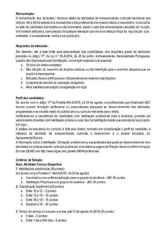 2. 2. Remuneração: A remuneração dos docentes / técnicos afetos às atividades de enriquecimento curricular reporta-se aos índices 126 e 89 da carreira dos educadores e dos professores dos ensinos básico e secundário consoante se trate de candidatos licenciados ou não licenciados, sendo o valor das remunerações calculado em função dos horários atribuídos, sem prejuízo de qualquer alteração que vier a ser feita por força da legislação que, entretanto, e eventualmente, venha a ser publicada. Requisitos de admissão: Ser detentor, até à data limite para apresentação das candidaturas, dos requisitos gerais de admissão previstos no artigo 17º. da Lei n.º 35-A/2014, de 20 de junho, nomeadamente: Nacionalidade Portuguesa, quando não dispensada pela Constituição, convenção especial ou lei especial; a. 18 Anos de idade completos; b. Não inibição do exercício de funções públicas ou não interdição para o exercício daquelas que se propõe a desempenhar; c. Robustez física e perfil psíquico indispensáveis ao exercício das funções; d. Cumprimento das leis de vacinação obrigatória; e. Nível habilitacional exigido na legislação em vigor Perfil dos candidatos: De acordo com o artigo 17º da Portaria 644-A/2015, de 24 de agosto, os profissionais que dinamizam AEC devem possuir formação profissional ou especializada adequada ao desenvolvimento das atividades programadas e ao escalão etário do público-alvo ou currículo relevante para o efeito. Verificando-se a inexistência de candidatos com habilitação profissional para a docência, poderão ser selecionados docentes com habilitação própria ou outro tipo de habilitação desde que prevista na legislação em vigor. A análise da relevância do currículo é feita pelo diretor, tomando em consideração o perfil do candidato, a natureza da atividade de enriquecimento curricular a desenvolver e o projeto educativo do Agrupamento/Escola. A informação sobre a habilitação / formação profissional ou especializada adequada ao desenvolvimento das atividades de enriquecimento curricular poderá ser consultada na página da Direção-Geral da Administração Escolar (DGAE) em http://www.dgae.mec.pt/web/14654/profissional. Critérios de Seleção Área: Atividade Física e Desportiva 1. Habilitações académicas (50 pontos) (de acordo com a Portaria n.º 644-A/2015, de 24 de agosto) a. Licenciados com profissionalização para os grupos de docência – 260: 50 pontos b. Habilitação Própria para os grupos de docência – 260: 25 pontos 2. Classificação académica (20 pontos) a. Entre 10 e 12 – 5 pontos b. Entre 13 e 15 – 10 pontos c. Entre 16 e 18 – 15 pontos d. Superior a 18 – 20 pontos 3. Tempo de serviço a concurso,em dias (até 31 de agosto de 2015) (30 pontos a. 0 dias – 0 pontos b. Entre 1 dia e 364 dias – 5 pontos