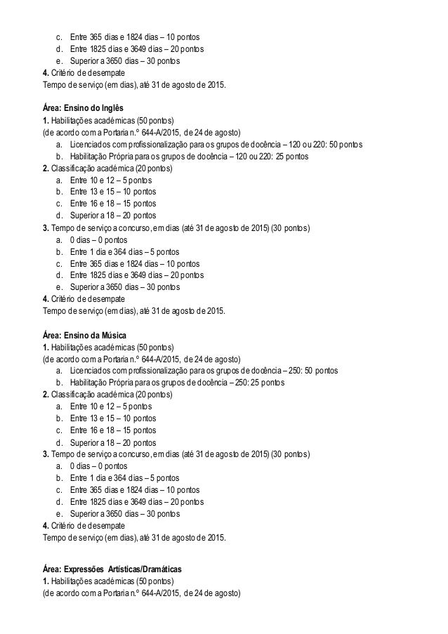3. 3. c. Entre 365 dias e 1824 dias – 10 pontos d. Entre 1825 dias e 3649 dias – 20 pontos e. Superior a 3650 dias – 30 pontos 4. Critério de desempate Tempo de serviço (em dias), até 31 de agosto de 2015. Área: Ensino do Inglês 1. Habilitações académicas (50 pontos) (de acordo com a Portaria n.º 644-A/2015, de 24 de agosto) a. Licenciados com profissionalização para os grupos de docência – 120 ou 220: 50 pontos b. Habilitação Própria para os grupos de docência – 120 ou 220: 25 pontos 2. Classificação académica (20 pontos) a. Entre 10 e 12 – 5 pontos b. Entre 13 e 15 – 10 pontos c. Entre 16 e 18 – 15 pontos d. Superior a 18 – 20 pontos 3. Tempo de serviço a concurso,em dias (até 31 de agosto de 2015) (30 pontos) a. 0 dias – 0 pontos b. Entre 1 dia e 364 dias – 5 pontos c. Entre 365 dias e 1824 dias – 10 pontos d. Entre 1825 dias e 3649 dias – 20 pontos e. Superior a 3650 dias – 30 pontos 4. Critério de desempate Tempo de serviço (em dias), até 31 de agosto de 2015. Área: Ensino da Música 1. Habilitações académicas (50 pontos) (de acordo com a Portaria n.º 644-A/2015, de 24 de agosto) a. Licenciados com profissionalização para os grupos de docência – 250: 50 pontos b. Habilitação Própria para os grupos de docência – 250: 25 pontos 2. Classificação académica (20 pontos) a. Entre 10 e 12 – 5 pontos b. Entre 13 e 15 – 10 pontos c. Entre 16 e 18 – 15 pontos d. Superior a 18 – 20 pontos 3. Tempo de serviço a concurso,em dias (até 31 de agosto de 2015) (30 pontos) a. 0 dias – 0 pontos b. Entre 1 dia e 364 dias – 5 pontos c. Entre 365 dias e 1824 dias – 10 pontos d. Entre 1825 dias e 3649 dias – 20 pontos e. Superior a 3650 dias – 30 pontos 4. Critério de desempate Tempo de serviço (em dias), até 31 de agosto de 2015. Área: Expressões Artísticas/Dramáticas 1. Habilitações académicas (50 pontos) (de acordo com a Portaria n.º 644-A/2015, de 24 de agosto)