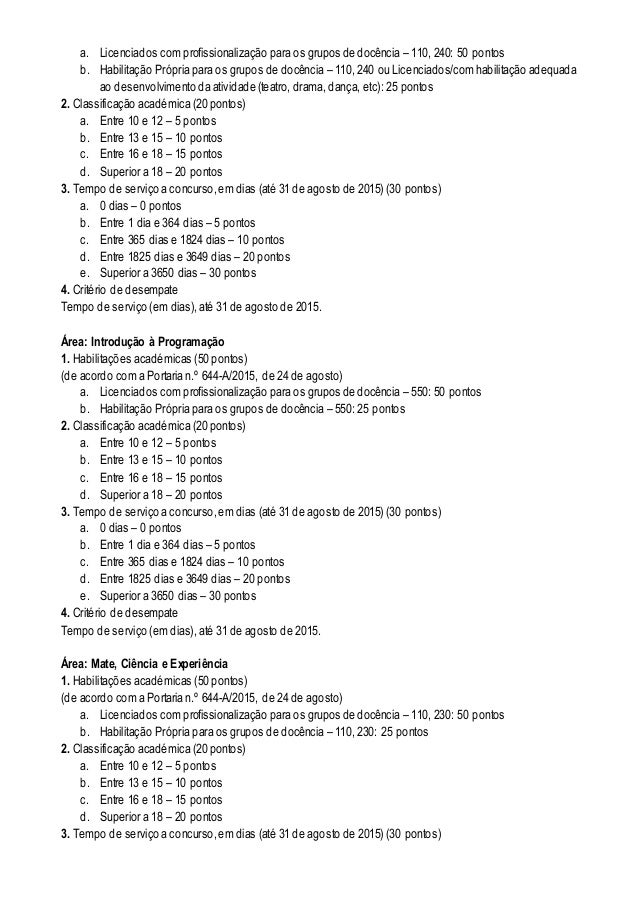 4. 4. a. Licenciados com profissionalização para os grupos de docência – 110, 240: 50 pontos b. Habilitação Própria para os grupos de docência – 110, 240 ou Licenciados/com habilitação adequada ao desenvolvimento da atividade (teatro, drama, dança, etc): 25 pontos 2. Classificação académica (20 pontos) a. Entre 10 e 12 – 5 pontos b. Entre 13 e 15 – 10 pontos c. Entre 16 e 18 – 15 pontos d. Superior a 18 – 20 pontos 3. Tempo de serviço a concurso,em dias (até 31 de agosto de 2015) (30 pontos) a. 0 dias – 0 pontos b. Entre 1 dia e 364 dias – 5 pontos c. Entre 365 dias e 1824 dias – 10 pontos d. Entre 1825 dias e 3649 dias – 20 pontos e. Superior a 3650 dias – 30 pontos 4. Critério de desempate Tempo de serviço (em dias), até 31 de agosto de 2015. Área: Introdução à Programação 1. Habilitações académicas (50 pontos) (de acordo com a Portaria n.º 644-A/2015, de 24 de agosto) a. Licenciados com profissionalização para os grupos de docência – 550: 50 pontos b. Habilitação Própria para os grupos de docência – 550: 25 pontos 2. Classificação académica (20 pontos) a. Entre 10 e 12 – 5 pontos b. Entre 13 e 15 – 10 pontos c. Entre 16 e 18 – 15 pontos d. Superior a 18 – 20 pontos 3. Tempo de serviço a concurso,em dias (até 31 de agosto de 2015) (30 pontos) a. 0 dias – 0 pontos b. Entre 1 dia e 364 dias – 5 pontos c. Entre 365 dias e 1824 dias – 10 pontos d. Entre 1825 dias e 3649 dias – 20 pontos e. Superior a 3650 dias – 30 pontos 4. Critério de desempate Tempo de serviço (em dias), até 31 de agosto de 2015. Área: Mate, Ciência e Experiência 1. Habilitações académicas (50 pontos) (de acordo com a Portaria n.º 644-A/2015, de 24 de agosto) a. Licenciados com profissionalização para os grupos de docência – 110, 230: 50 pontos b. Habilitação Própria para os grupos de docência – 110, 230: 25 pontos 2. Classificação académica (20 pontos) a. Entre 10 e 12 – 5 pontos b. Entre 13 e 15 – 10 pontos c. Entre 16 e 18 – 15 pontos d. Superior a 18 – 20 pontos 3. Tempo de serviço a concurso,em dias (até 31 de agosto de 2015) (30 pontos)
