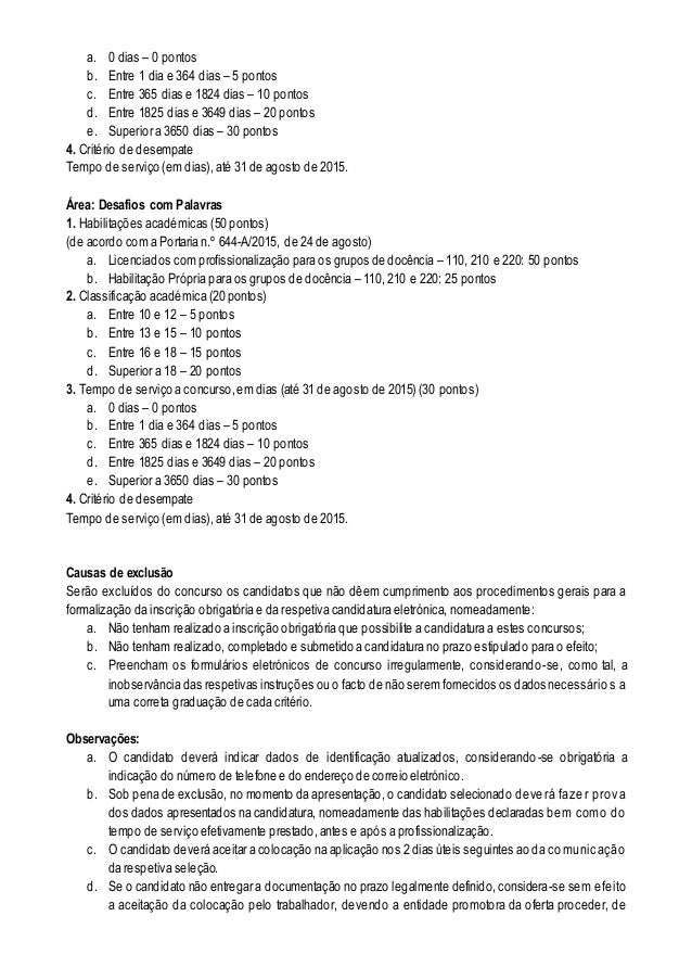 5. 5. a. 0 dias – 0 pontos b. Entre 1 dia e 364 dias – 5 pontos c. Entre 365 dias e 1824 dias – 10 pontos d. Entre 1825 dias e 3649 dias – 20 pontos e. Superior a 3650 dias – 30 pontos 4. Critério de desempate Tempo de serviço (em dias), até 31 de agosto de 2015. Área: Desafios com Palavras 1. Habilitações académicas (50 pontos) (de acordo com a Portaria n.º 644-A/2015, de 24 de agosto) a. Licenciados com profissionalização para os grupos de docência – 110, 210 e 220: 50 pontos b. Habilitação Própria para os grupos de docência – 110, 210 e 220: 25 pontos 2. Classificação académica (20 pontos) a. Entre 10 e 12 – 5 pontos b. Entre 13 e 15 – 10 pontos c. Entre 16 e 18 – 15 pontos d. Superior a 18 – 20 pontos 3. Tempo de serviço a concurso,em dias (até 31 de agosto de 2015) (30 pontos) a. 0 dias – 0 pontos b. Entre 1 dia e 364 dias – 5 pontos c. Entre 365 dias e 1824 dias – 10 pontos d. Entre 1825 dias e 3649 dias – 20 pontos e. Superior a 3650 dias – 30 pontos 4. Critério de desempate Tempo de serviço (em dias), até 31 de agosto de 2015. Causas de exclusão Serão excluídos do concurso os candidatos que não dêem cumprimento aos procedimentos gerais para a formalização da inscrição obrigatória e da respetiva candidatura eletrónica, nomeadamente: a. Não tenham realizado a inscrição obrigatória que possibilite a candidatura a estes concursos; b. Não tenham realizado, completado e submetido a candidatura no prazo estipulado para o efeito; c. Preencham os formulários eletrónicos de concurso irregularmente, considerando-se, como tal, a inobservância das respetivas instruções ou o facto de não serem fornecidos os dados necessários a uma correta graduação de cada critério. Observações: a. O candidato deverá indicar dados de identificação atualizados, considerando-se obrigatória a indicação do número de telefone e do endereço de correio eletrónico. b. Sob pena de exclusão, no momento da apresentação, o candidato selecionado deverá fazer prova dos dados apresentados na candidatura, nomeadamente das habilitações declaradas bem como do tempo de serviço efetivamente prestado,antes e após a profissionalização. c. O candidato deverá aceitar a colocação na aplicação nos 2 dias úteis seguintes ao da comunicação da respetiva seleção. d. Se o candidato não entregar a documentação no prazo legalmente definido,considera-se sem efeito a aceitação da colocação pelo trabalhador, devendo a entidade promotora da oferta proceder, de