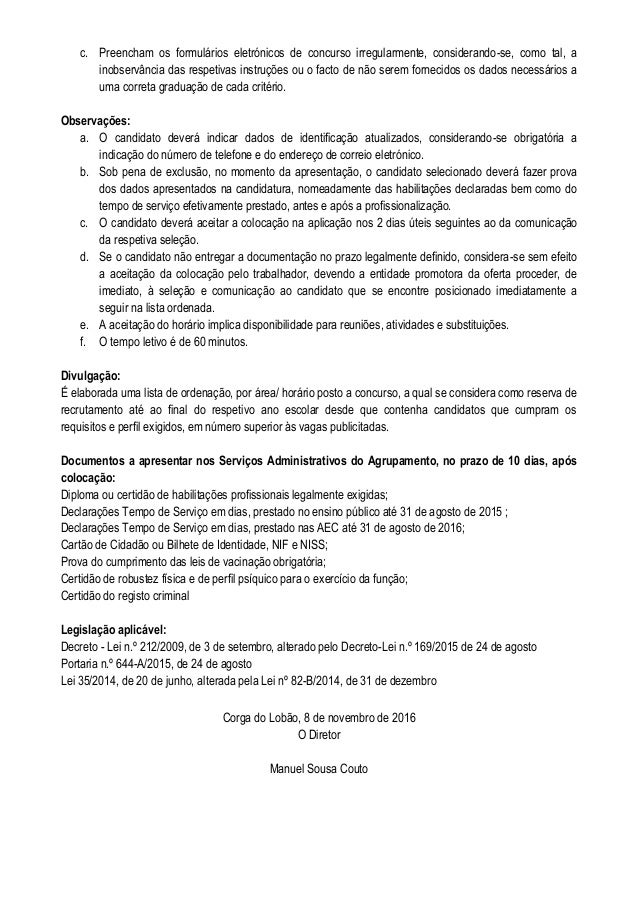 3. 3. c. Preencham os formulários eletrónicos de concurso irregularmente, considerando-se, como tal, a inobservância das respetivas instruções ou o facto de não serem fornecidos os dados necessários a uma correta graduação de cada critério. Observações: a. O candidato deverá indicar dados de identificação atualizados, considerando-se obrigatória a indicação do número de telefone e do endereço de correio eletrónico. b. Sob pena de exclusão, no momento da apresentação, o candidato selecionado deverá fazer prova dos dados apresentados na candidatura, nomeadamente das habilitações declaradas bem como do tempo de serviço efetivamente prestado, antes e após a profissionalização. c. O candidato deverá aceitar a colocação na aplicação nos 2 dias úteis seguintes ao da comunicação da respetiva seleção. d. Se o candidato não entregar a documentação no prazo legalmente definido, considera-se sem efeito a aceitação da colocação pelo trabalhador, devendo a entidade promotora da oferta proceder, de imediato, à seleção e comunicação ao candidato que se encontre posicionado imediatamente a seguir na lista ordenada. e. A aceitação do horário implica disponibilidade para reuniões, atividades e substituições. f. O tempo letivo é de 60 minutos. Divulgação: É elaborada uma lista de ordenação, por área/ horário posto a concurso, a qual se considera como reserva de recrutamento até ao final do respetivo ano escolar desde que contenha candidatos que cumpram os requisitos e perfil exigidos, em número superior às vagas publicitadas. Documentos a apresentar nos Serviços Administrativos do Agrupamento, no prazo de 10 dias, após colocação: Diploma ou certidão de habilitações profissionais legalmente exigidas; Declarações Tempo de Serviço em dias, prestado no ensino público até 31 de agosto de 2015 ; Declarações Tempo de Serviço em dias, prestado nas AEC até 31 de agosto de 2016; Cartão de Cidadão ou Bilhete de Identidade, NIF e NISS; Prova do cumprimento das leis de vacinação obrigatória; Certidão de robustez física e de perfil psíquico para o exercício da função; Certidão do registo criminal Legislação aplicável: Decreto - Lei n.º 212/2009, de 3 de setembro, alterado pelo Decreto-Lei n.º 169/2015 de 24 de agosto Portaria n.º 644-A/2015, de 24 de agosto Lei 35/2014, de 20 de junho, alterada pela Lei nº 82-B/2014, de 31 de dezembro Corga do Lobão, 8 de novembro de 2016 O Diretor Manuel Sousa Couto