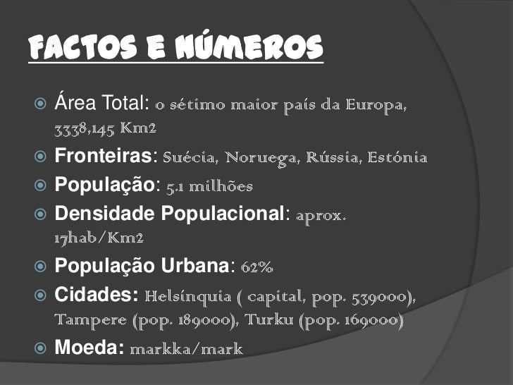 2. 2. Factos e Números <br />Área Total: o sétimo maior país da Europa, 3338,145 Km2<br />Fronteiras: Suécia, Noruega, Rússia, Estónia<br />População: 5.1 milhões<br />Densidade Populacional: aprox. 17hab/Km2<br />População Urbana: 62%<br />Cidades:Helsínquia ( capital, pop. 539000), Tampere (pop. 189000), Turku (pop. 169000)<br />Moeda:markka/mark<br />