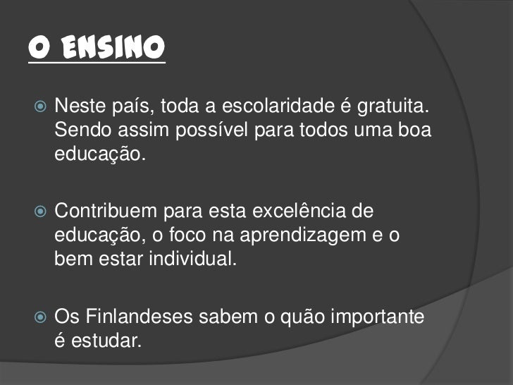 4. 4. O Ensino<br />Neste país, toda a escolaridade é gratuita. Sendo assim possível para todos uma boa educação.<br />Contribuem para esta excelência de educação, o foco na aprendizagem e o bem estar individual.<br />Os Finlandeses sabem o quão importante é estudar.<br />