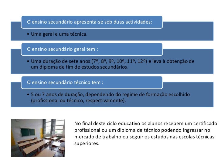 4. 4. No final deste ciclo educativo os alunos recebem um certificado profissional ou um diploma de técnico podendo ingressar no mercado de trabalho ou seguir os estudos nas escolas técnicas superiores. <br />