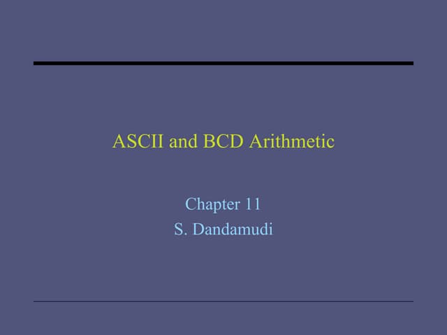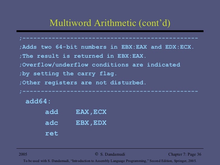 36. 36. Multiword Arithmetic (cont’d) <ul><li>;------------------------------------------------ </li></ul><ul><li>;Adds two 64-bit numbers in EBX:EAX and EDX:ECX. </li></ul><ul><li>;The result is returned in EBX:EAX. </li></ul><ul><li>;Overflow/underflow conditions are indicated </li></ul><ul><li>;by setting the carry flag. </li></ul><ul><li>;Other registers are not disturbed. </li></ul><ul><li>;------------------------------------------------ </li></ul><ul><li>add64: </li></ul><ul><li>add EAX,ECX </li></ul><ul><li>adc EBX,EDX </li></ul><ul><li>ret </li></ul>