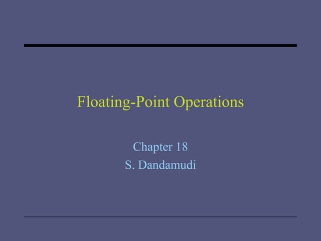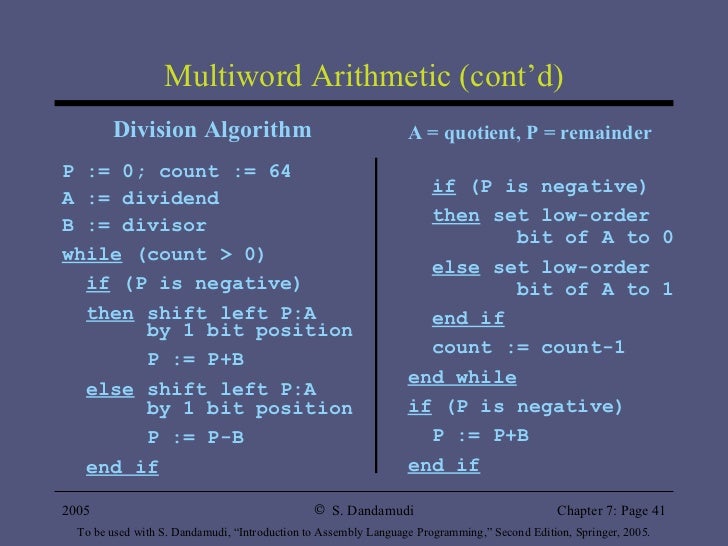 41. 41. Multiword Arithmetic (cont’d) <ul><li>Division Algorithm </li></ul><ul><li>P := 0; count := 64 </li></ul><ul><li>A := dividend </li></ul><ul><li>B := divisor </li></ul><ul><li>while (count > 0) </li></ul><ul><li>if (P is negative) </li></ul><ul><li>then shift left P:A </li></ul><ul><li>by 1 bit position </li></ul><ul><li>P := P+B </li></ul><ul><li>else shift left P:A </li></ul><ul><li>by 1 bit position </li></ul><ul><li>P := P-B </li></ul><ul><li>end if </li></ul><ul><li>A = quotient, P = remainder </li></ul><ul><li>if (P is negative) </li></ul><ul><li>then set low-order </li></ul><ul><li>bit of A to 0 </li></ul><ul><li>else set low-order </li></ul><ul><li>bit of A to 1 </li></ul><ul><li>end if </li></ul><ul><li>count := count-1 </li></ul><ul><li>end while </li></ul><ul><li>if (P is negative) </li></ul><ul><li>P := P+B </li></ul><ul><li>end if </li></ul>