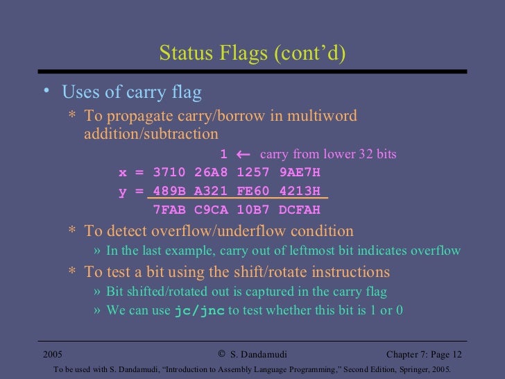 12. 12. Status Flags (cont’d) <ul><li>Uses of carry flag </li></ul><ul><ul><li>To propagate carry/borrow in multiword addition/subtraction </li></ul></ul><ul><ul><ul><ul><li>1  carry from lower 32 bits </li></ul></ul></ul></ul><ul><ul><ul><ul><li>x = 3710 26A8 1257 9AE7H </li></ul></ul></ul></ul><ul><ul><ul><ul><li>y = 489B A321 FE60 4213H </li></ul></ul></ul></ul><ul><ul><ul><ul><li>7FAB C9CA 10B7 DCFAH </li></ul></ul></ul></ul><ul><ul><li>To detect overflow/underflow condition </li></ul></ul><ul><ul><ul><li>In the last example, carry out of leftmost bit indicates overflow </li></ul></ul></ul><ul><ul><li>To test a bit using the shift/rotate instructions </li></ul></ul><ul><ul><ul><li>Bit shifted/rotated out is captured in the carry flag </li></ul></ul></ul><ul><ul><ul><li>We can use jc/jnc to test whether this bit is 1 or 0 </li></ul></ul></ul>