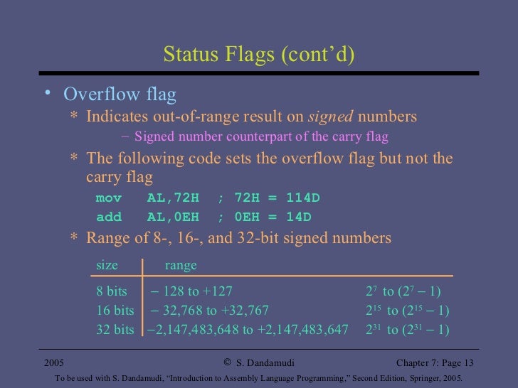 13. 13. Status Flags (cont’d) <ul><li>Overflow flag </li></ul><ul><ul><li>Indicates out-of-range result on signed numbers </li></ul></ul><ul><ul><ul><ul><li>Signed number counterpart of the carry flag </li></ul></ul></ul></ul><ul><ul><li>The following code sets the overflow flag but not the carry flag </li></ul></ul><ul><ul><ul><li>mov AL,72H ; 72H = 114D </li></ul></ul></ul><ul><ul><ul><li>add AL,0EH ; 0EH = 14D </li></ul></ul></ul><ul><ul><li>Range of 8-, 16-, and 32-bit signed numbers </li></ul></ul><ul><ul><ul><li>size range </li></ul></ul></ul><ul><ul><ul><li>8 bits  128 to +127 2 7 to (2 7  1) </li></ul></ul></ul><ul><ul><ul><li>16 bits  32,768 to +32,767 2 15 to (2 15  1) </li></ul></ul></ul><ul><ul><ul><li>32 bits  2,147,483,648 to +2,147,483,647 2 31 to (2 31  1) </li></ul></ul></ul>