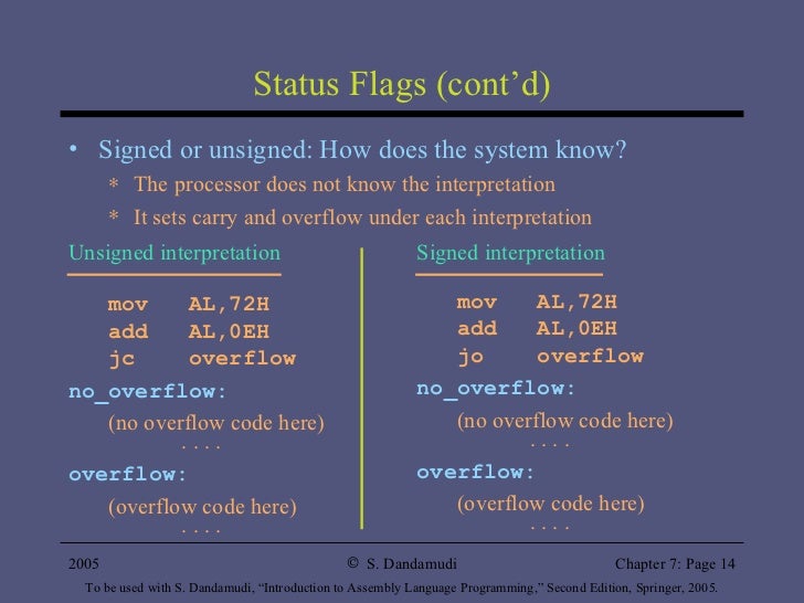 14. 14. Status Flags (cont’d) <ul><li>Unsigned interpretation </li></ul><ul><ul><li>mov AL,72H </li></ul></ul><ul><ul><li>add AL,0EH </li></ul></ul><ul><ul><li>jc overflow </li></ul></ul><ul><li>no_overflow: </li></ul><ul><ul><li>(no overflow code here) </li></ul></ul><ul><ul><li>. . . . </li></ul></ul><ul><li>overflow: </li></ul><ul><ul><li>(overflow code here) </li></ul></ul><ul><ul><li>. . . . </li></ul></ul><ul><li>Signed interpretation </li></ul><ul><ul><li>mov AL,72H </li></ul></ul><ul><ul><li>add AL,0EH </li></ul></ul><ul><ul><li>jo overflow </li></ul></ul><ul><li>no_overflow: </li></ul><ul><ul><li>(no overflow code here) </li></ul></ul><ul><ul><li>. . . . </li></ul></ul><ul><li>overflow: </li></ul><ul><ul><li>(overflow code here) </li></ul></ul><ul><ul><li>. . . . </li></ul></ul><ul><li>Signed or unsigned: How does the system know? </li></ul><ul><ul><li>The processor does not know the interpretation </li></ul></ul><ul><ul><li>It sets carry and overflow under each interpretation </li></ul></ul>