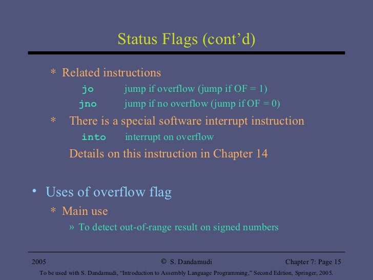 15. 15. Status Flags (cont’d) <ul><ul><li>Related instructions </li></ul></ul><ul><ul><ul><li>jo jump if overflow (jump if OF = 1) </li></ul></ul></ul><ul><ul><ul><li>jno jump if no overflow (jump if OF = 0) </li></ul></ul></ul><ul><ul><li>There is a special software interrupt instruction </li></ul></ul><ul><ul><ul><li>into interrupt on overflow </li></ul></ul></ul><ul><ul><li>Details on this instruction in Chapter 14 </li></ul></ul><ul><li>Uses of overflow flag </li></ul><ul><ul><li>Main use </li></ul></ul><ul><ul><ul><li>To detect out-of-range result on signed numbers </li></ul></ul></ul>