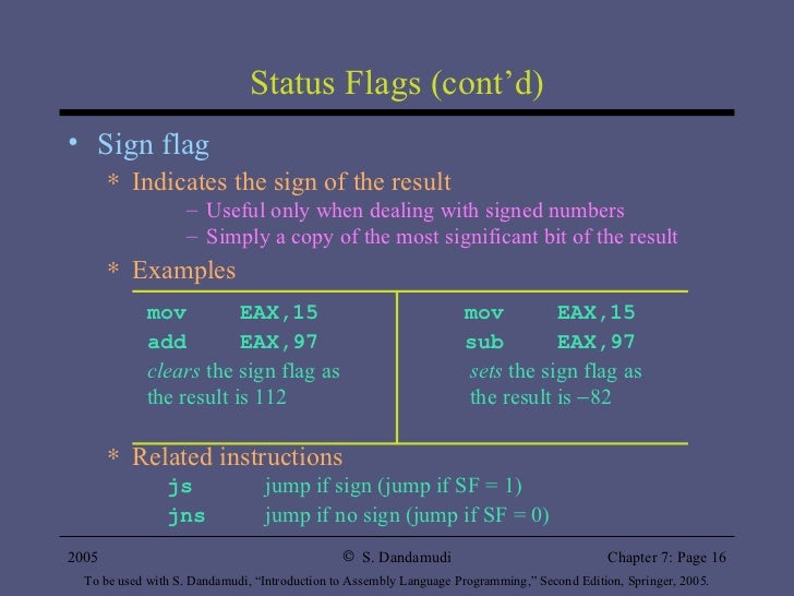 16. 16. Status Flags (cont’d) <ul><li>Sign flag </li></ul><ul><ul><li>Indicates the sign of the result </li></ul></ul><ul><ul><ul><ul><li>Useful only when dealing with signed numbers </li></ul></ul></ul></ul><ul><ul><ul><ul><li>Simply a copy of the most significant bit of the result </li></ul></ul></ul></ul><ul><ul><li>Examples </li></ul></ul><ul><ul><ul><li>mov EAX,15 mov EAX,15 </li></ul></ul></ul><ul><ul><ul><li>add EAX,97 sub EAX,97 </li></ul></ul></ul><ul><ul><ul><li>clears the sign flag as sets the sign flag as </li></ul></ul></ul><ul><ul><ul><li>the result is 112 the result is  82 </li></ul></ul></ul><ul><ul><ul><li> </li></ul></ul></ul><ul><ul><li>Related instructions </li></ul></ul><ul><ul><ul><li>js jump if sign (jump if SF = 1) </li></ul></ul></ul><ul><ul><ul><li>jns jump if no sign (jump if SF = 0) </li></ul></ul></ul>