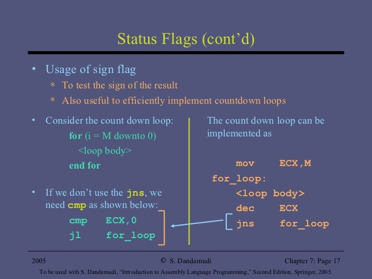 17. 17. Status Flags (cont’d) <ul><li>Consider the count down loop: </li></ul><ul><ul><ul><li>for (i = M downto 0) </li></ul></ul></ul><ul><ul><ul><li><loop body> </li></ul></ul></ul><ul><ul><ul><li>end for </li></ul></ul></ul><ul><li>If we don’t use the jns , we need cmp as shown below: </li></ul><ul><ul><ul><li>cmp ECX,0 </li></ul></ul></ul><ul><ul><ul><li>jl for_loop </li></ul></ul></ul><ul><li>The count down loop can be implemented as </li></ul><ul><ul><li>mov ECX,M </li></ul></ul><ul><ul><li>for_loop: </li></ul></ul><ul><ul><li><loop body> </li></ul></ul><ul><ul><li>dec ECX </li></ul></ul><ul><ul><li>jns for_loop </li></ul></ul><ul><li>Usage of sign flag </li></ul><ul><ul><li>To test the sign of the result </li></ul></ul><ul><ul><li>Also useful to efficiently implement countdown loops </li></ul></ul>